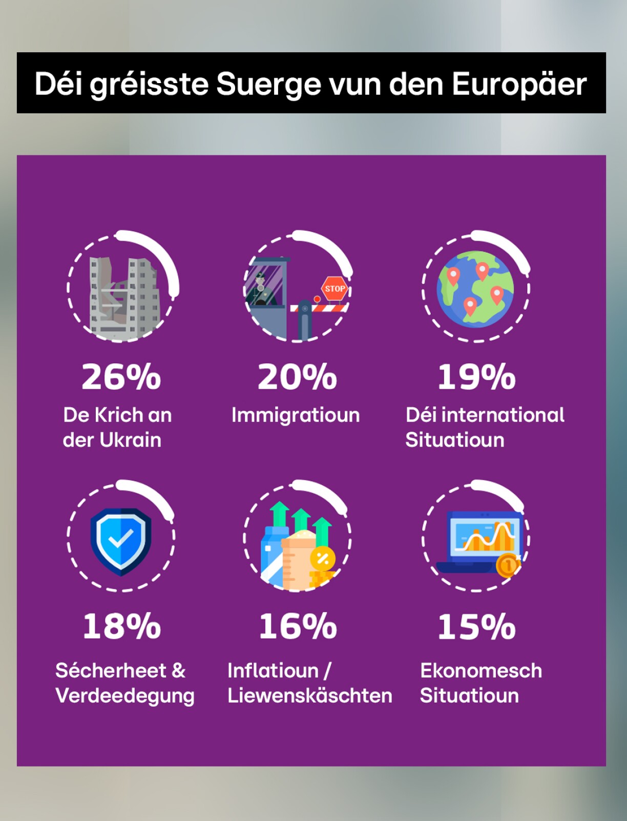 Wat déi gréisste politesch Erausfuerderungen, virun deenen d’EU steet, ubelaangt si 26 Prozent vun de Lëtzebuerger Residenten der Meenung, dass déi russesch Invasioun vun der Ukrain dee gréissten Defi ass. Dat entsprécht genee der EU-Moyenne. Iwwerdeem mécht ee sech hei am Land allerdéngs iwwerduerchschnëttlech vill Suergen iwwer d’Immigratioun. 24 Prozent vun de Leit sinn der Meenung, dass dës dee gréissten Challenge fir d’Unioun ass. An der Moyenne vun den EU-Länner sinn et 20 Prozent vun de Leit.