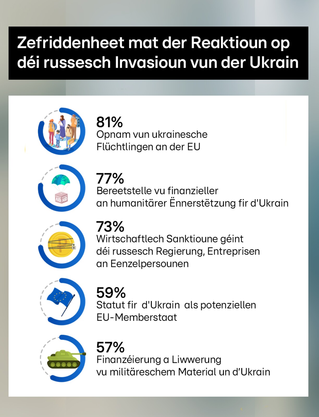 An dëser Ronn vum Eurobarometer goufen d’Leit dann och gefrot, wat si vun der EU hirer Reaktioun op déi russesch Invasioun vun der Ukrain halen. Zu Lëtzebuerg gouf dës am allgemengen e bësse méi positiv gesinn, wéi an der EU-Moyenne. Esou sinn 90 Prozent vun de Residenten der Meenung, dass et richteg ass, Leit, déi viru Krich flüchten an der EU opzehuelen an 83 Prozent fannen et richteg, der Ukrain finanziell an humanitär Hëllefen zoukommen ze loossen. Dat géigeniwwer 81 respektiv 77 Prozent am EU-Duerchschnëtt.