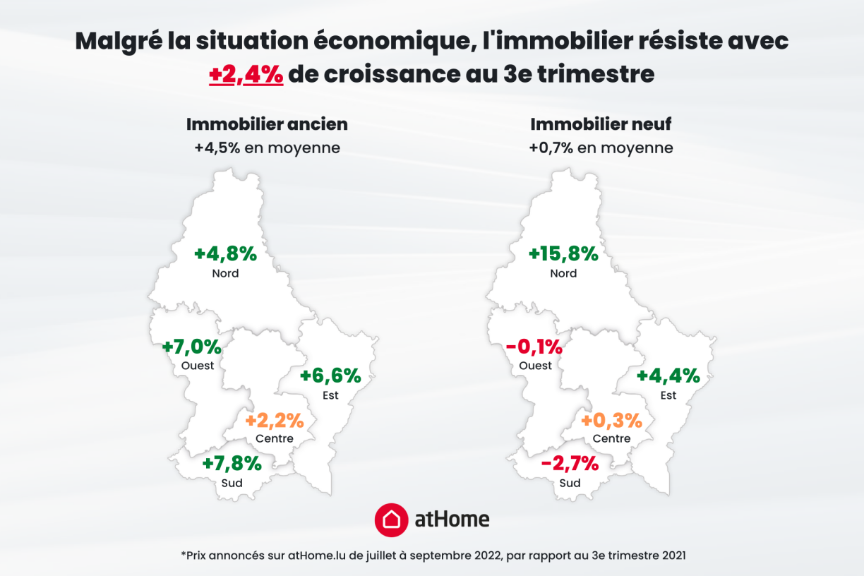 Obwuel d’Zënsen op den Immobiliëprêten déi lescht Zäit an d’Luucht gaange sinn an den Immobiliëmarché ënner Drock gesat hunn, ginn déi annoncéiert Präisser vun de Wunnenge weider an d’Luucht. atHome notéiert en Donneschdeg a senger leschter Publikatioun eng Hausse vun 2,4% am drëtten Trimester. De Logementsmarché géif der méi schlechter wirtschaftlecher Situatioun widderstoen.