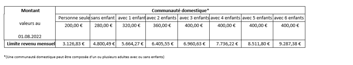 Sou kritt zum Beispill eng eenzel Persoun oder Famill mat engem Kand 320 Euro de Mount bezuelt, dat bei enger maximaler Pai vu ronn 5.660 Euro. Eng Famill mat 3 oder méi Kanner kritt eng Subventioun vu 400 Euro fir dëse Stot, natierlech och gekoppelt un déi iewescht Limitte vun de Paien.