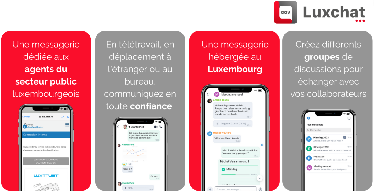 “Éischtens gëtt déi App integral an Datenzenteren um Lëtzebuerger Territoire bedriwwen, d’Kommunikatioune sinn End-to-End verschlësselt. D’App ass gratis fir de Notzer an se ass och ouni Reklammen. D’Eegenschafte vun der Luxchat4Gov-App bidden dem ëffentleche Secteur e séchert Kommunikatiounsmëttel, andeems och d’Donnéeën, déi do zirkuléieren, protegéiert sinn. Mat der App garantéiert de Staat, dass absolut keen anere wéi de Benotzer vun der App an d’Leit mat deenen ee kommunizéiert d’Messagë liese kënnen an och keen Zougang zu den eventuellen Dateien huet. An der internationaler Diskussioun - an déi gëtt och reegelméisseg zu Lëtzebuerg gefouert - gëtt dacks iwwer eng national digital Souveränitéit geschwat punkto Date-Gestioun a fir déi ze garantéieren, ass dat hei e klore Virdeel, an aus deem Grond eraus, wollte mer dat als Staat maachen.”