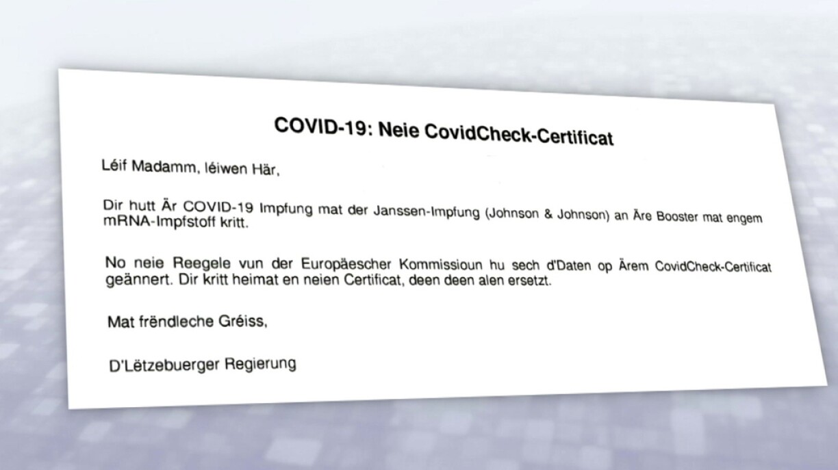 Ugangs stoung um Impfcertificat 3/3, esou wéi wann een eben 2 Dosen + 1 Boosterimpfung krut. Dat gouf awer rezent geännert, wat op Basis vun enger Recommandatioun vun der EU geschitt ass. Deemno steet bei Leit mat 1 Impfdosis Janssen + 1 mRNa-Booster 2/1, wat esou och hei am Land als komplett Impfung unerkannt ass.