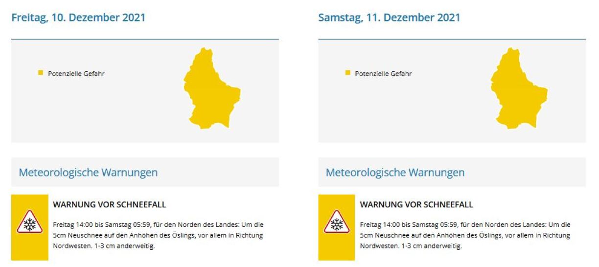 D’Warnung gëllt tëscht Freideg 14 Auer a geet bis den nächsten Dag ëm 6 Auer. Am Éislek ass mat ronn 5 Zentimeter Schnéi ze rechnen, virun allem am Nordweste vum Land. Fir de Recht vum Land sinn 1 bis 3 Zentimeter Schnéi gemellt.