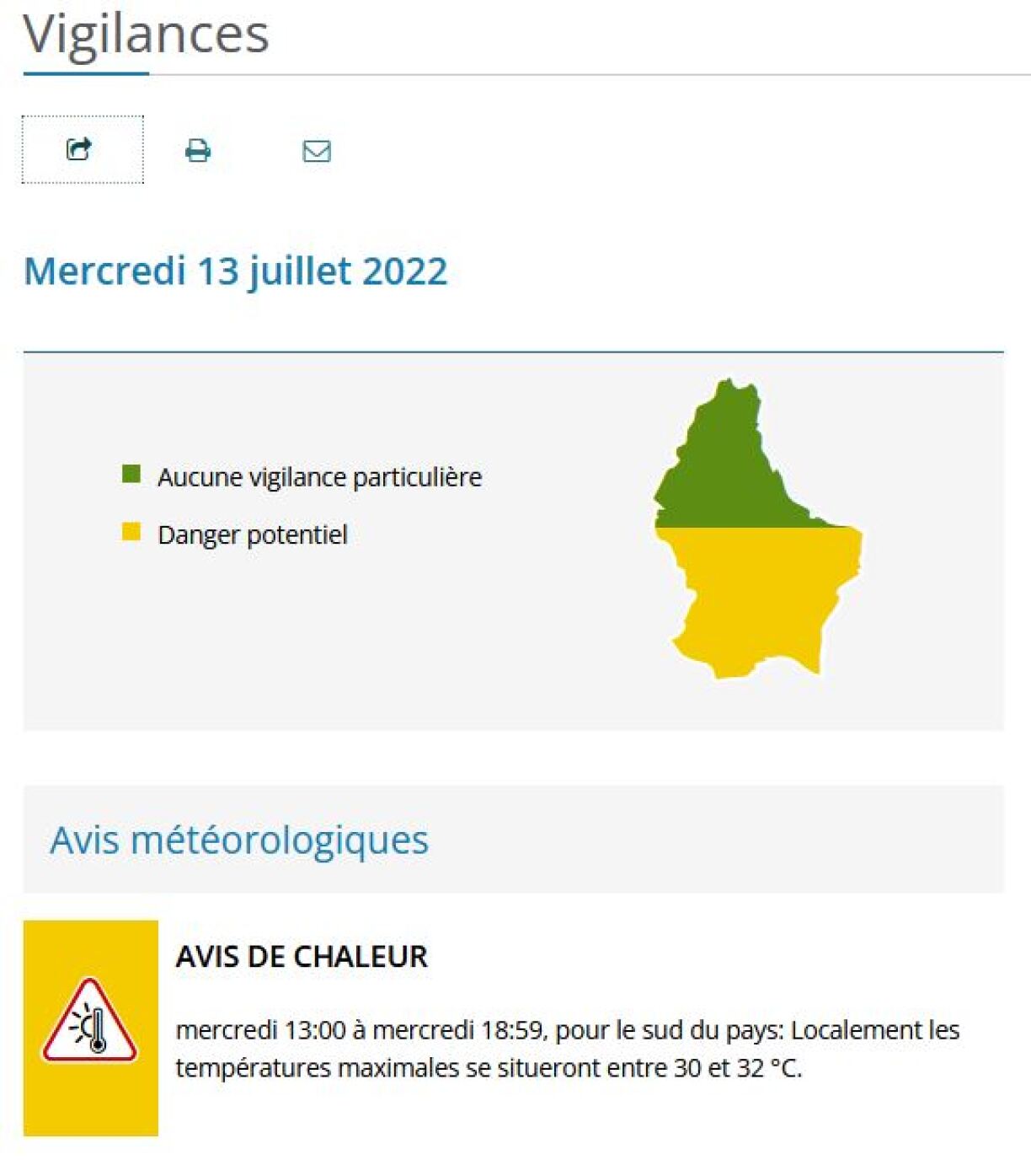 Bis e Mëttwoch den Owend 19 Auer ass deemno mat Temperature vun 30 bis 32 Grad ze rechnen. Et gëllt dowéinst eng Alerte Jaune.