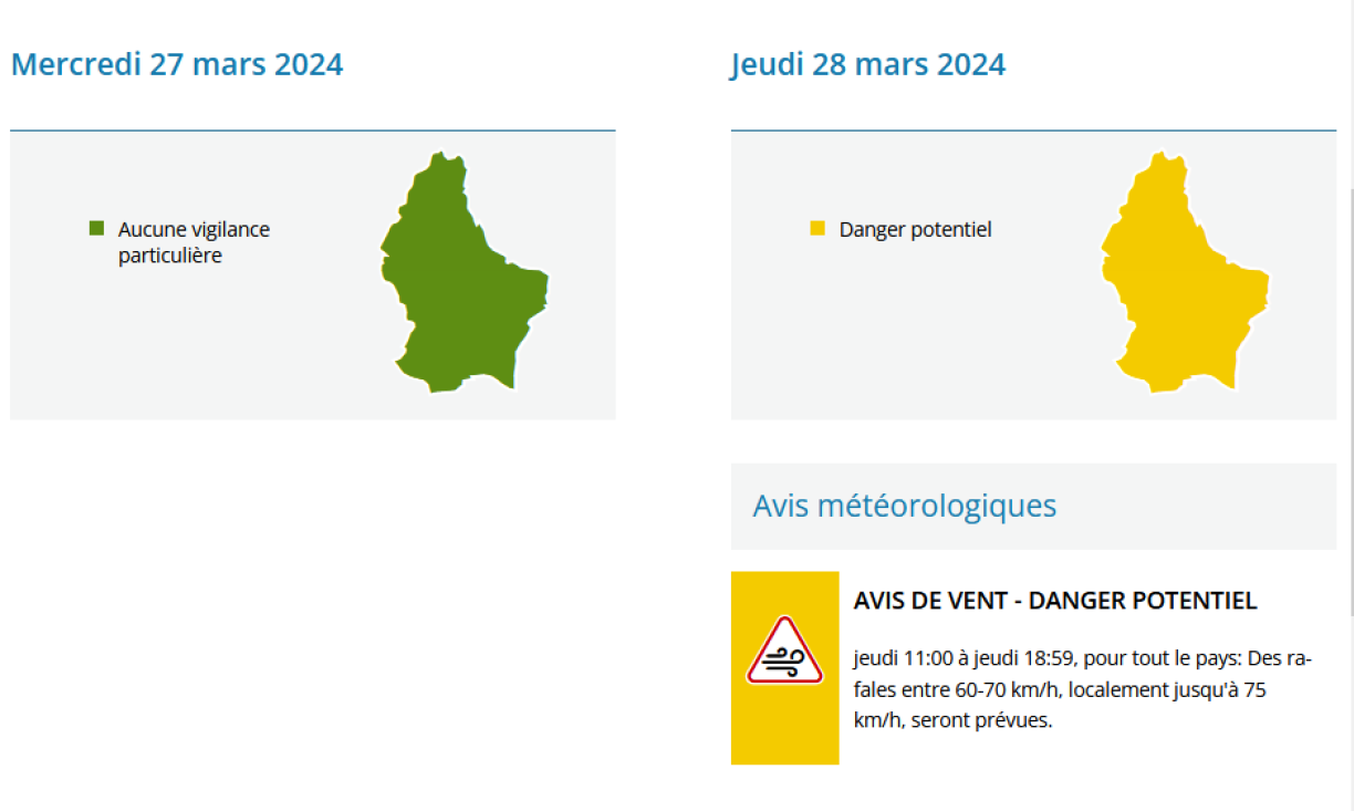En Donneschdeg dann ass mat staarkem Wand vu bis zu 75 Kilometer an der Stonn awer och ëmmer nees, grad am Moien, mat vereenzelte Schaueren ze rechnen, dat bei 7 bis 12 Grad. E Freideg léist de Wand e bëssen no an et wäert méi opklären, awer kann et lokal ëmmer nees zu Schauere kommen, hei bei maximal 13 Grad.