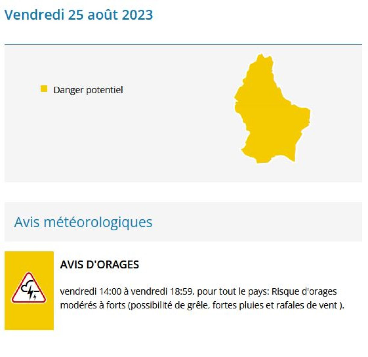 Déi national Wiederagence Meteolux warnt viru moderate bis schwéieren Donnerwiederen e Freideg am Nomëtteg. D’Alerte jaune gëllt vu 14 Auer un an zitt sech nach bis an den Owend, ëm 19 Auer, eran. Nieft Donner a Blëtz kënne plazeweis och Knëppelsteng a staarke Reen erofkommen, dat bei staarke Wandstéiss.