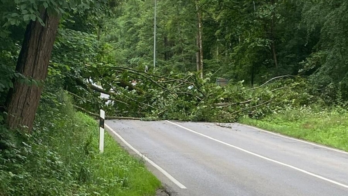 D’Police mellt dann e Sonndeg den Owend och nach ee Bam, deen op der N14 am Blummendall d’Strooss blockéiert. Duerch déi néideg Opraumaarbechte bleift d’Streck bis e Méindeg de Moie gespaart. Deviatioune si gezeechent: De Verkéier gëtt iwwert den CR121 respektiv iwwer den CR129 (via Guedber) geleet.