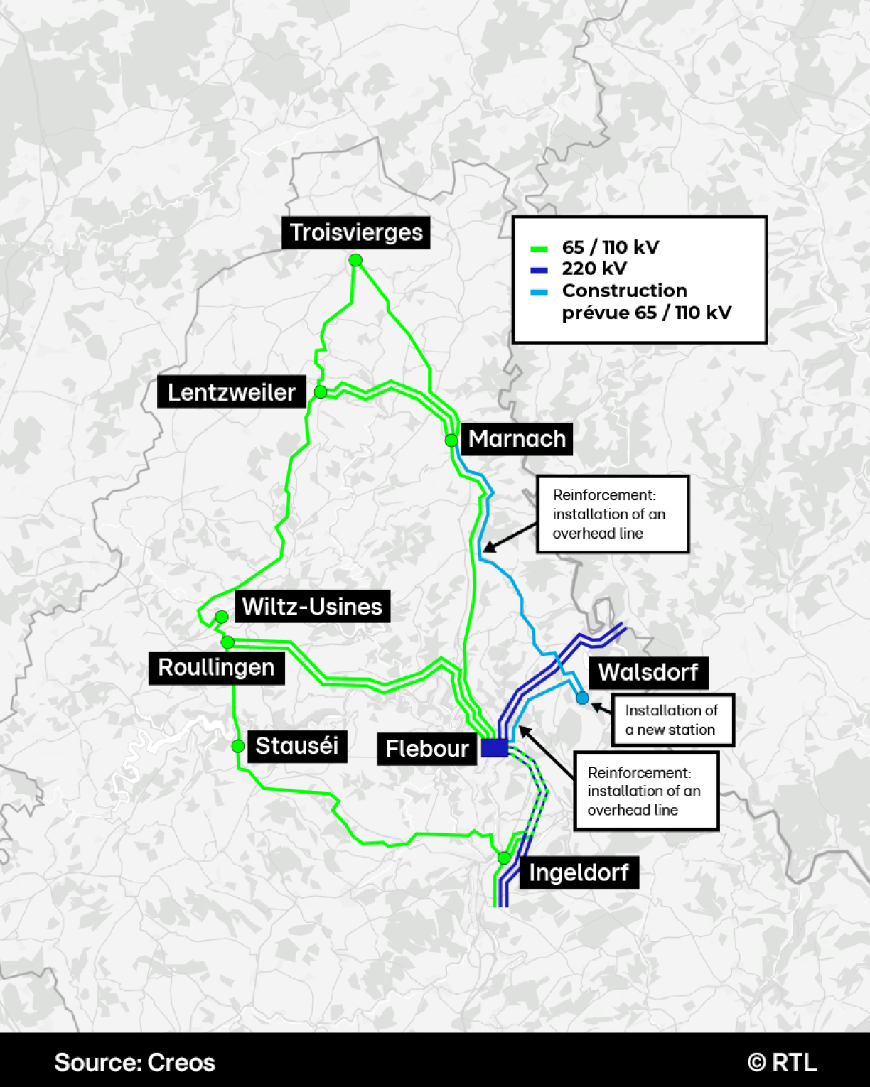 “Et eis erlaabt lo mëttelfristeg d’Kapazitéiten tëscht dem Héichspannungsposte Fléiber an der Nordboucle eropzesetzen. Mir hunn nach een zweete Projet, dat ass eben de ganzen Upgrade vun der bestoender Nordleitung op 110 KV. Deen ass geplangt, fir 2030 realiséiert ze sinn. A mat dëser Leitung schafe mer een Enkpass ewech, dee mer dann awer Enn 2026, wann d’Leitung a Betrib ka goen, garantéiert kréien.”