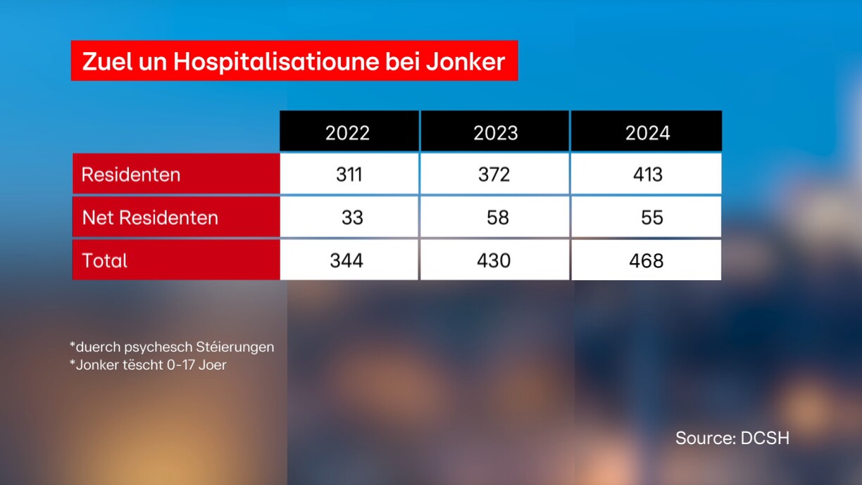 Tëscht 2022 an 2024 sinn d’stationär Hospitalisatioune bei Jonken tëscht 0 a 17 Joer am Beräich Santé mentale zu Lëtzebuerg ëm 36 Prozent an d’Luucht gaangen.
