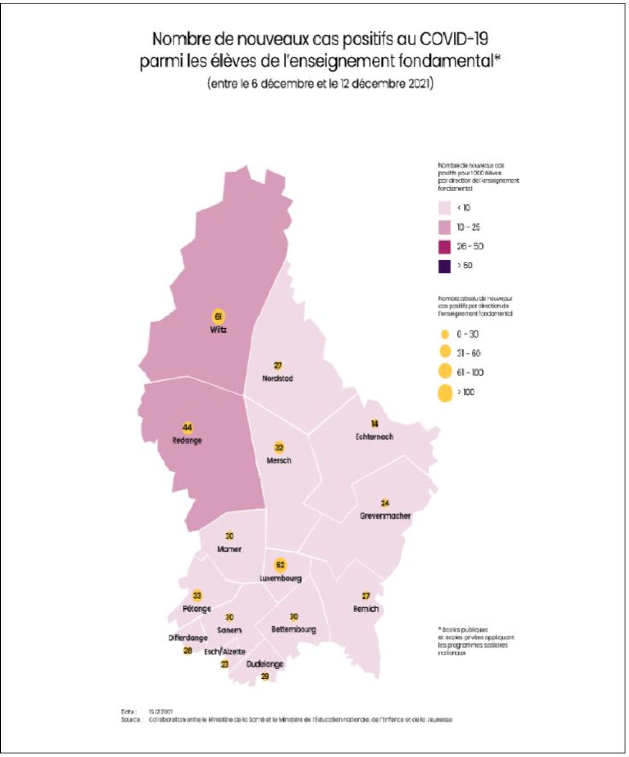 Eng éischte Kéier ass am Wochebilan vun der Santé och eng Kaart, déi weist a wéi enge Géigenden an der Grondschoul de Virus am meeschten zirkuléiert. Do fällt op, datt aktuell de Süden zum Beispill manner betraff ass wéi dat mol an der Vergaangenheet de Fall war. Déi meeschten Neiinfektiounen gouf et am Beräich vun de Schouldirektiounen vu Wolz a Réiden.
