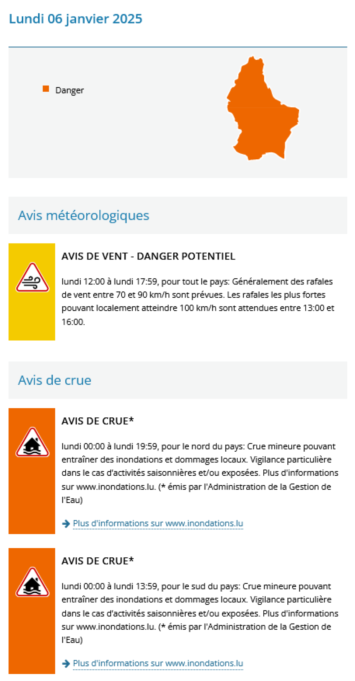 Wéi d’Waasserverwaltung e Sonndeg um Mëtteg nach matgedeelt hat, war dat ganzt Land, ofgesi vun der Musel, an d’Vigilance Orange fir Héichwaasser gesat ginn. E Méindeg huet sech dat allerdéngs geännert. Wärend am Norde vum Land an och am Süden keng “Vigilance Orange Innondations” méi besteet, goufen d’Uertschaften op der Musel an de Beräich vun der “Cote de vigilance jaune” gesat. Och dës konnt am Laf vun en Dënschdeg de Moien opgehuewe ginn.