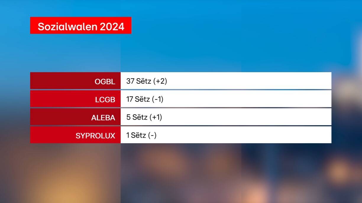 Den OGBL huet domadder zwee Sëtz méi wéi no de leschte Walen, allerdéngs ass de Landesverband zënter dem 31. Januar offiziell Deel vum Onofhängege Gewerkschaftsbond an hat bis elo zwee Mandater. Fir den LCGB ass et e Sëtz manner.