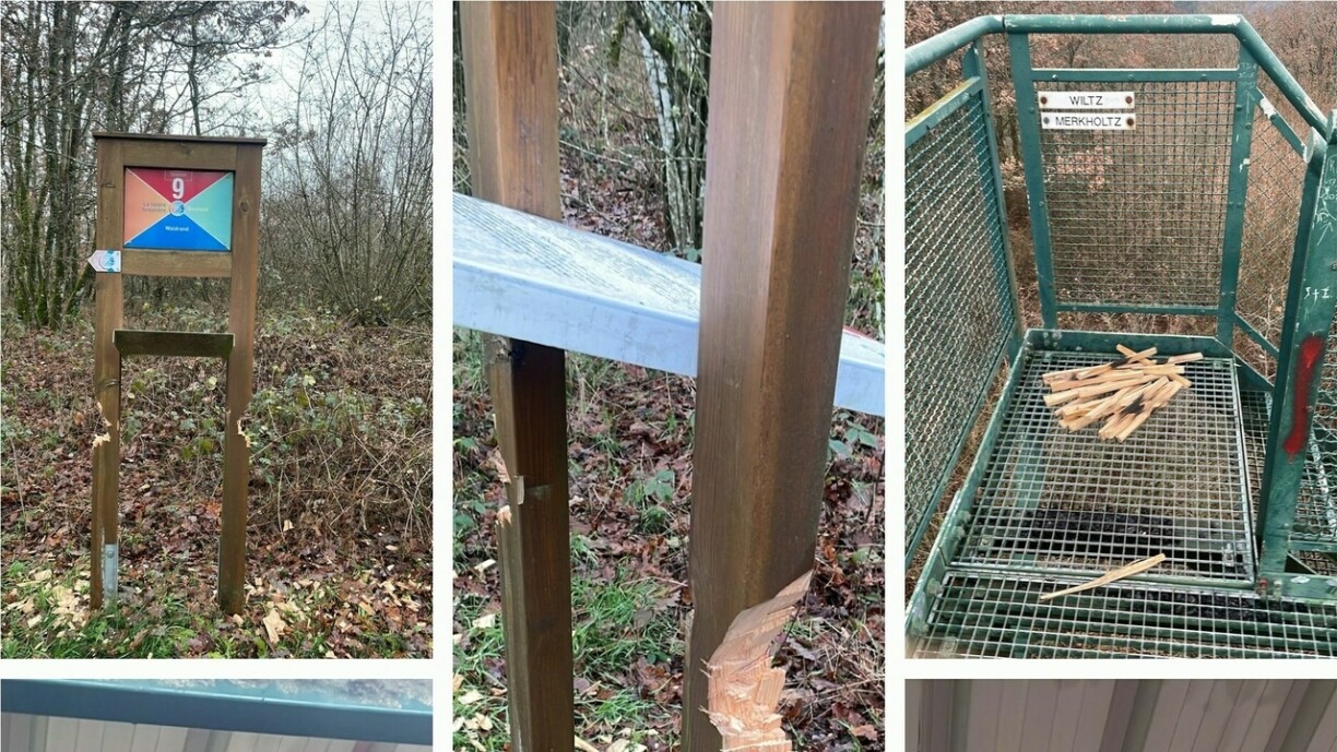 Et géif een dovunner ausgoen, datt d’Informatiounstafele mat enger Aaxt beschiedegt gi wieren. Doriwwer eraus wier probéiert ginn, am Aussiichtstuerm e Feier ze maachen. Och Graffiti ass do fonnt ginn, wéi op de Fotoe vun der Gemeng ze gesinn ass. “Well d’Spueren nach frësch sinn, huele mir un, datt dëst an de leschten 2-3 Deeg gemaach gouf”, esou d’Gemeng op Facebook.