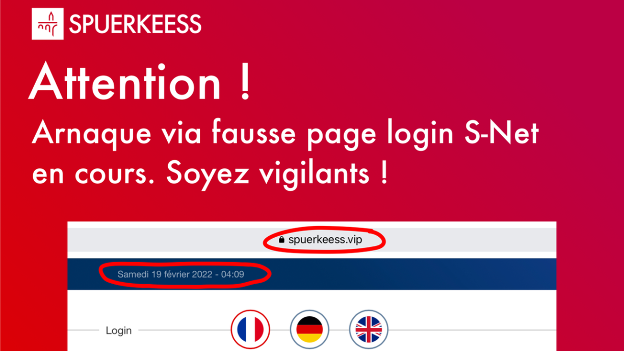 Vun der Spuerkeess heescht et weider an de soziale Medien, datt een, fir sécher ze goen, iwwert de Knäppchen “Mon espace S-Net” op spuerkeess.lu soll an den S-Net eragoen.