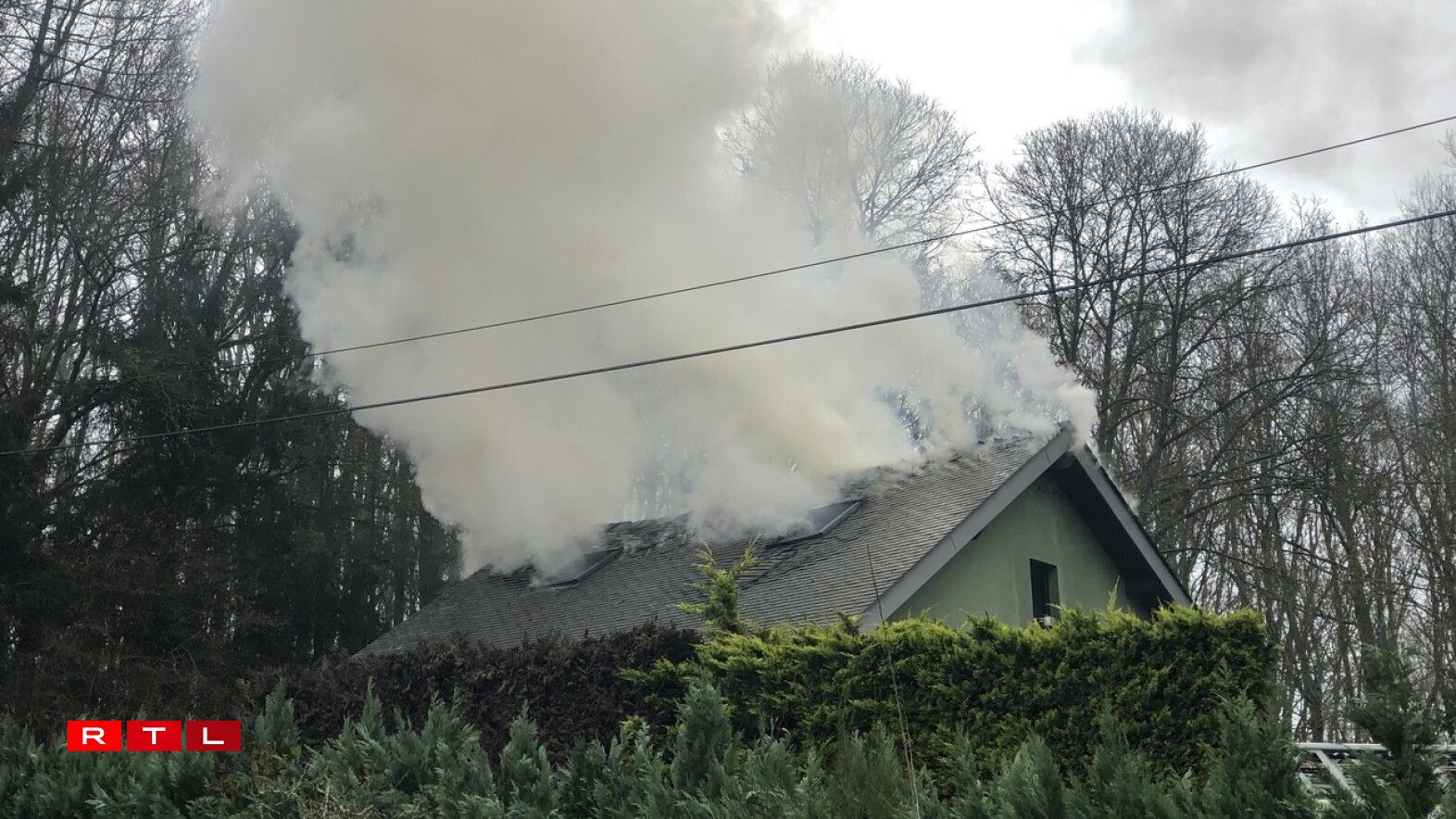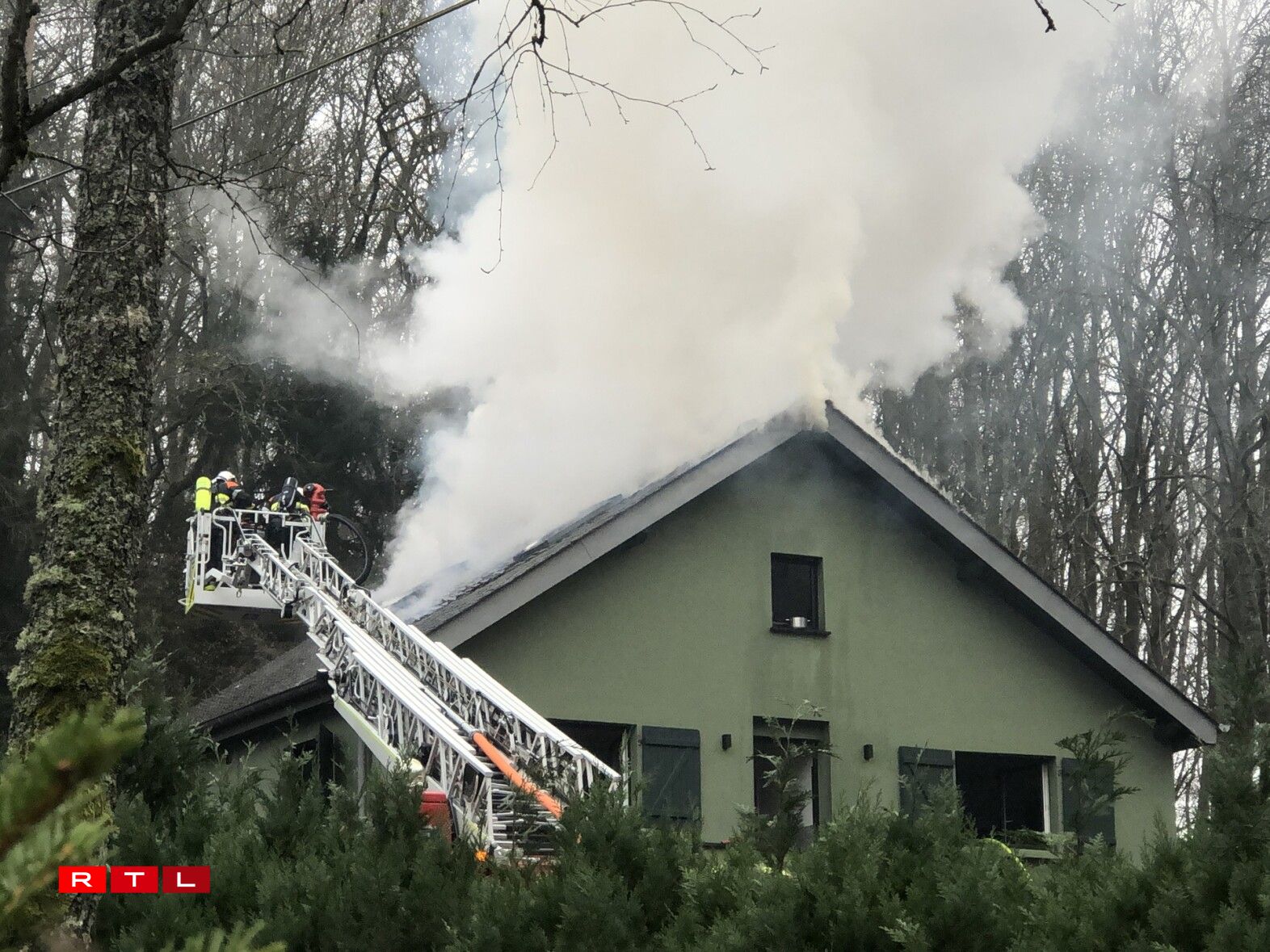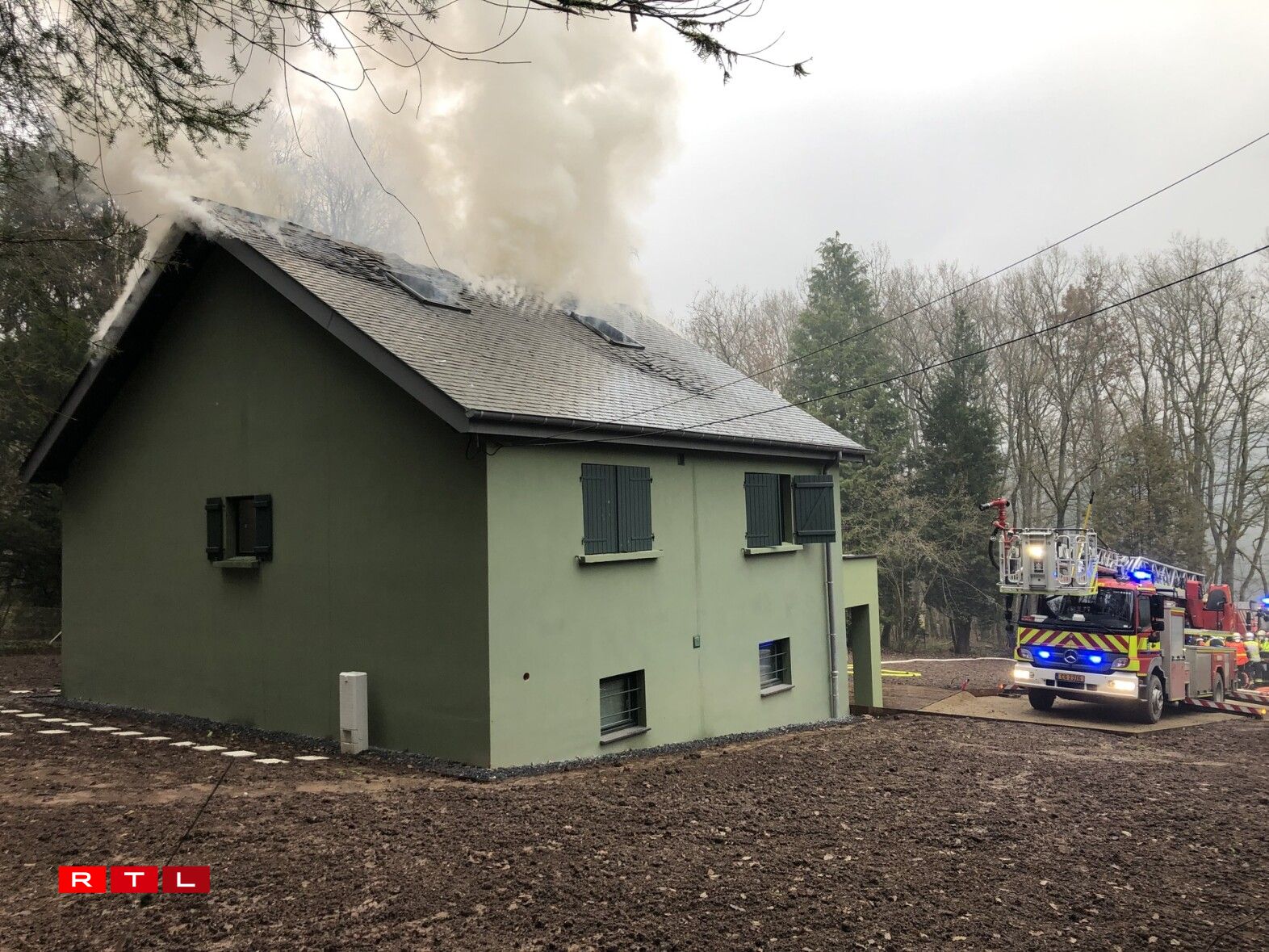 En Haus ass hei a Brand geroden. Éischten Informatiounen no schéngt de Brand ënnert dem Daach ausgebrach ze sinn. Wéi et vum CGDIS heescht, wier keng Persoun blesséiert ginn.