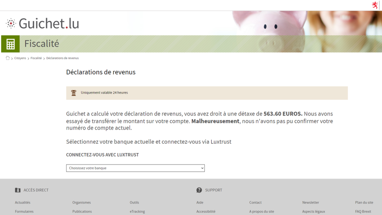 D’SMS selwer soll vun enger polnescher Nummer kommen, déi een da weider op e gefälschte Site vu Guichet.lu weiderleet. Hei gëtt een da gefrot, sech mat sengem Luxtrust-Account unzemellen, fir sou de Remboursement vun der Steiererklärung iwwerwisen ze kréien.