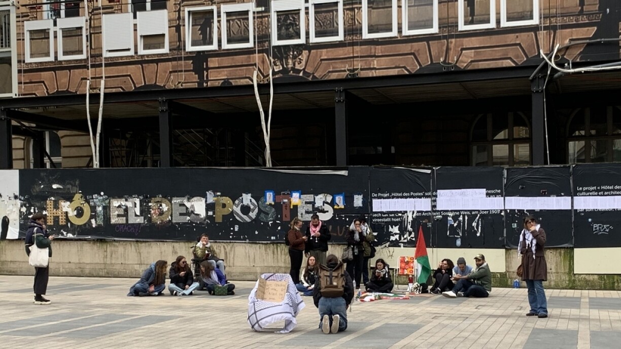 Zanter 10 Auer um fréieren Aldringen virun der Post eng Rei Gruppéierungen am Gaang, zesummen d’Nimm vun Dausenden Kanner virzeliesen, déi “am Genozid duerch den israeelesche Staat massakréiert” gi wären. Mat Amenter waren 15 bis 20 Manifestanten op der Plaz.
