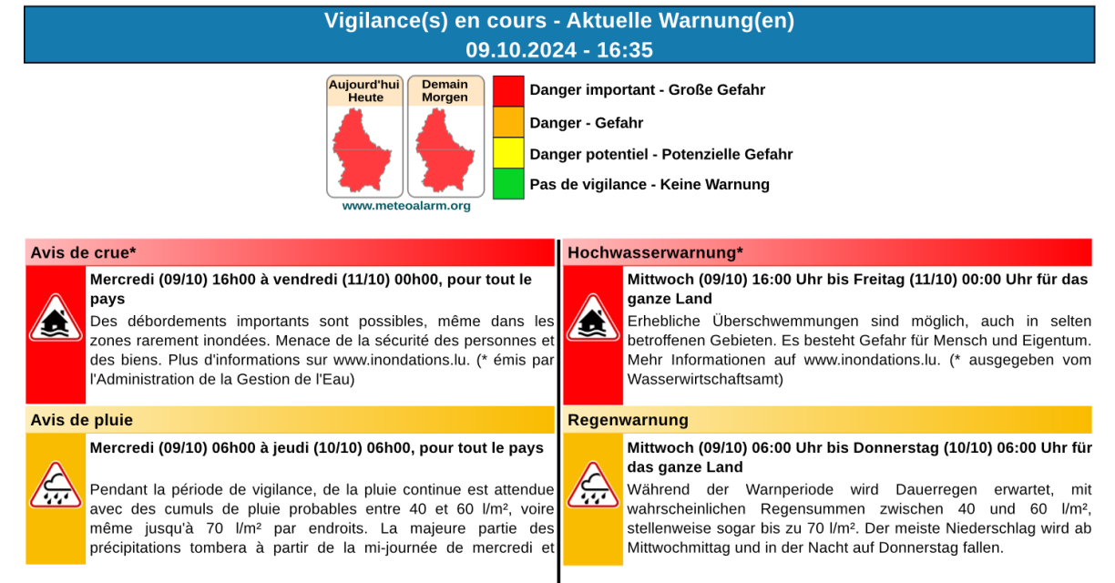 Weitere Informationen finden Sie auf den offiziellen Websites www.meteolux.lu, www.infocrise.lu, www.inondations.lu.
