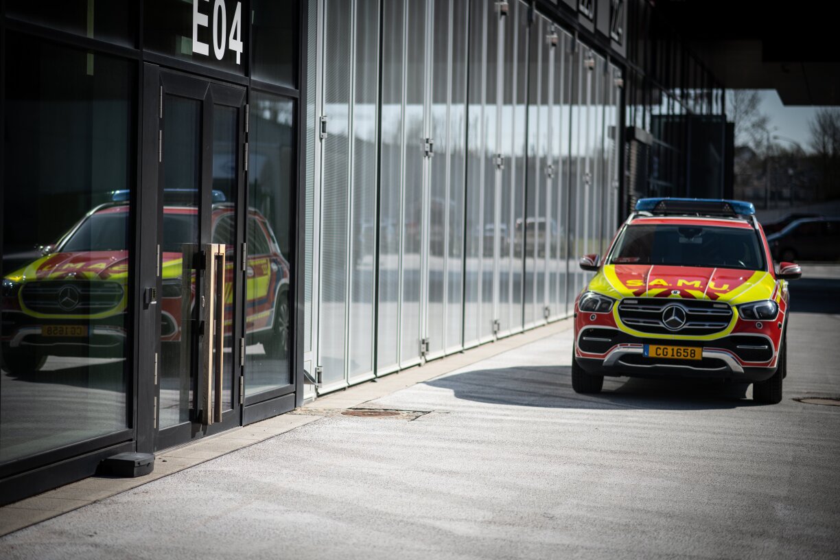 Da gouf kuerz virun 8 Auer eng Persoun an der Rue Large zu Esch-Uelzecht vun engem Auto ugestouss a blesséiert. Hei waren déi lokal Ekippe vum CGDIS am Asaz.