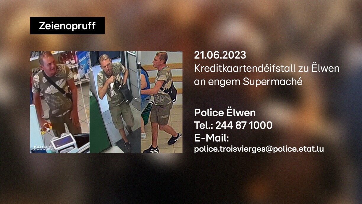 Warscheinlech gouf den 21. Juni 2023 an engem Supermarché zu Ëlwen eng Kreditkaart geklaut. Den Deeg drop, de 25. an de 26. Juni, gouf direkt an e puer Geschäfter uechter d’Land - ënnert anerem an der Stad, zu Ettelbréck an zu Esch - mat der geklauter Kaart bezuelt.