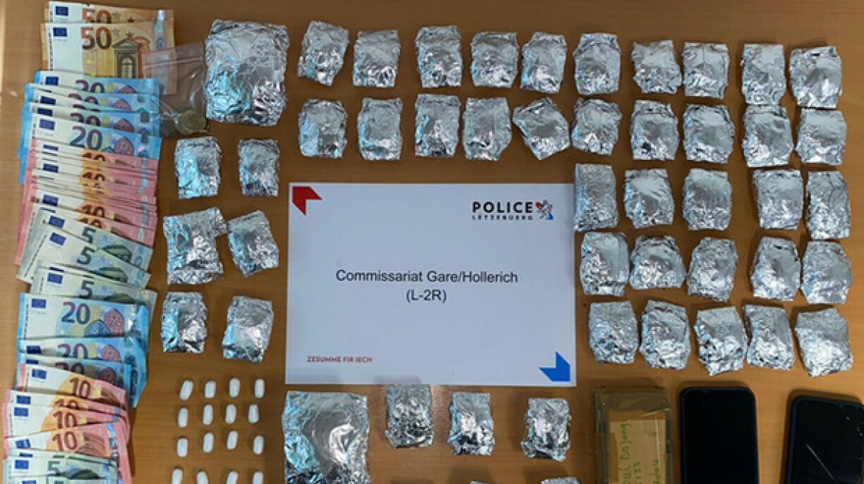 De Mann gouf doropshi mat op de Policebüro geholl. Hei hunn d’Beamte 57 Tuten, an deenen insgesamt 300 Gramm Cannabis waren, bei him séchergestallt. Ausserdeem hat hie 5 Handyen a 707 Euro Boergeld bei sech. Wärend senger Flucht hat de Mann iwwerdeems 16 Plombe mat Kokain a weider 22 Gramm Cannabis ewechgehäit.