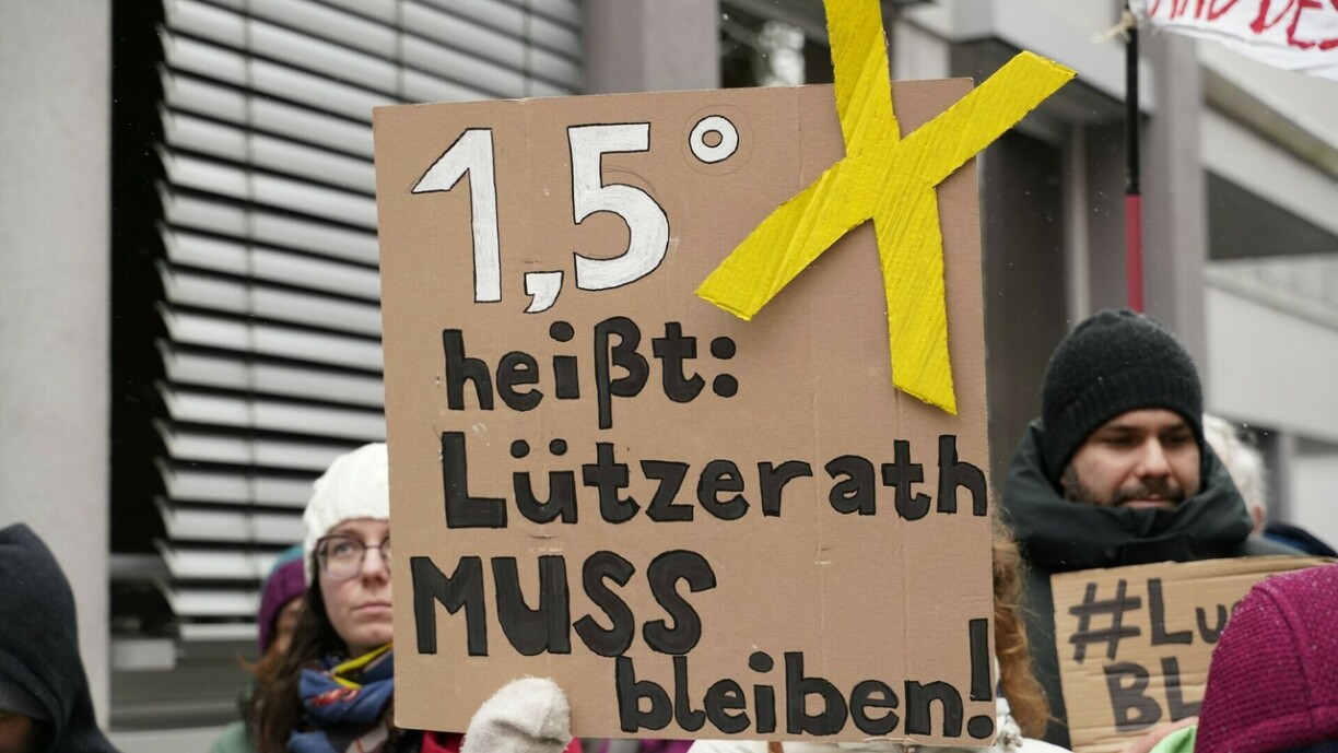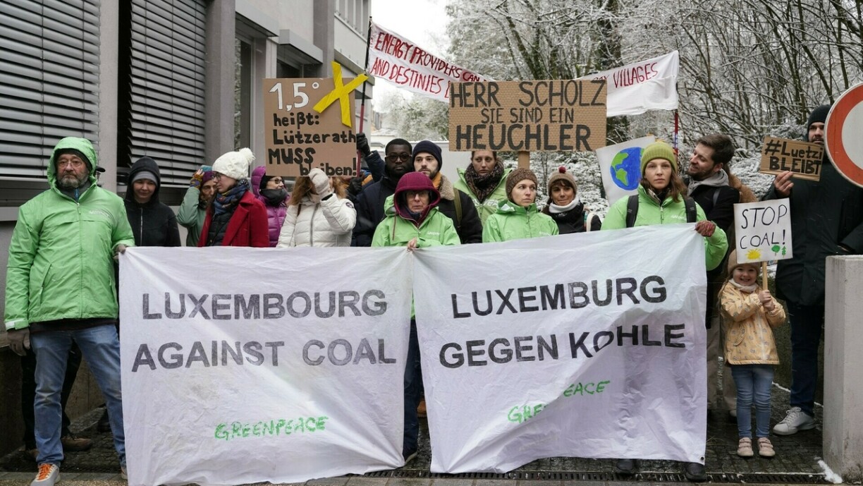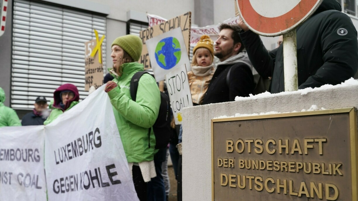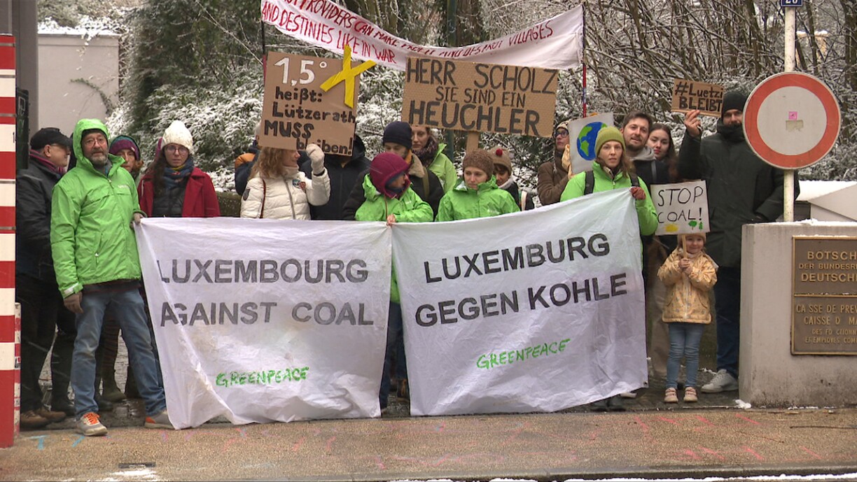 “1,5 Grad heißt Lützerath muss bleiben”, sou steet et op engem Plakat vun den Demonstranten hei virun der däitscher Ambassade an der Stad. Wann d’Duerf Lützerath fir den Ofbau vu Kuel géing ofgerappt ginn, kéint Däitschland seng Klimaziler net méi anhalen. Datt Lützerath iwwerhaapt kann ofgerappt ginn, geet aus engem Accord tëscht dem däitsche Wirtschaftsministere an dem Energiekonzern RWE ervir. Hei heescht et, datt RWE bis 2030 ophale muss Kuel ze verbrennen, wann se dofir Lützerath kënnen ofrappen. Bis 2030 ka RWE hei dann nach ganzer 280 Milliounen Tonne Kuel ausgruewen. Dem Thoma Forgiarini vu Greenpeace no, wier dat ee faule Kompromëss: