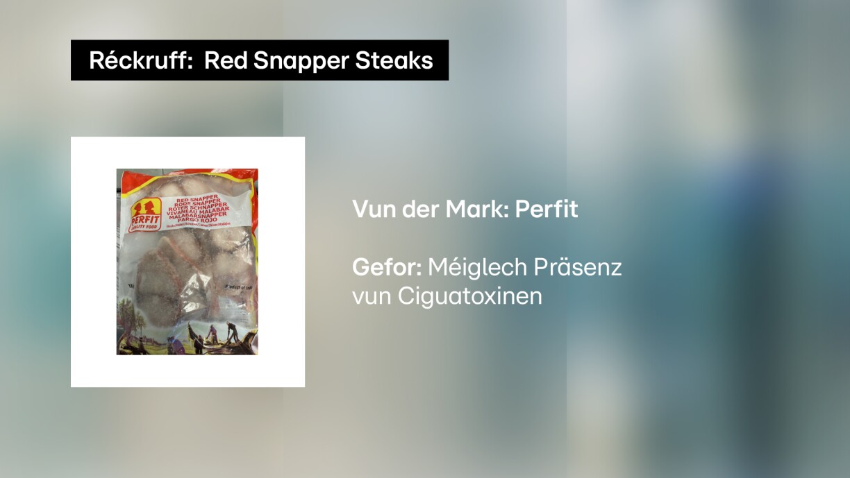 D’Red Snapper Steaks” vun der Mark Perfit, mat dem Haltbarkeetsdatum 10/04/2027 (MHD) a mat der Lousnummer 25-00409, ginn zeréckgeruff.