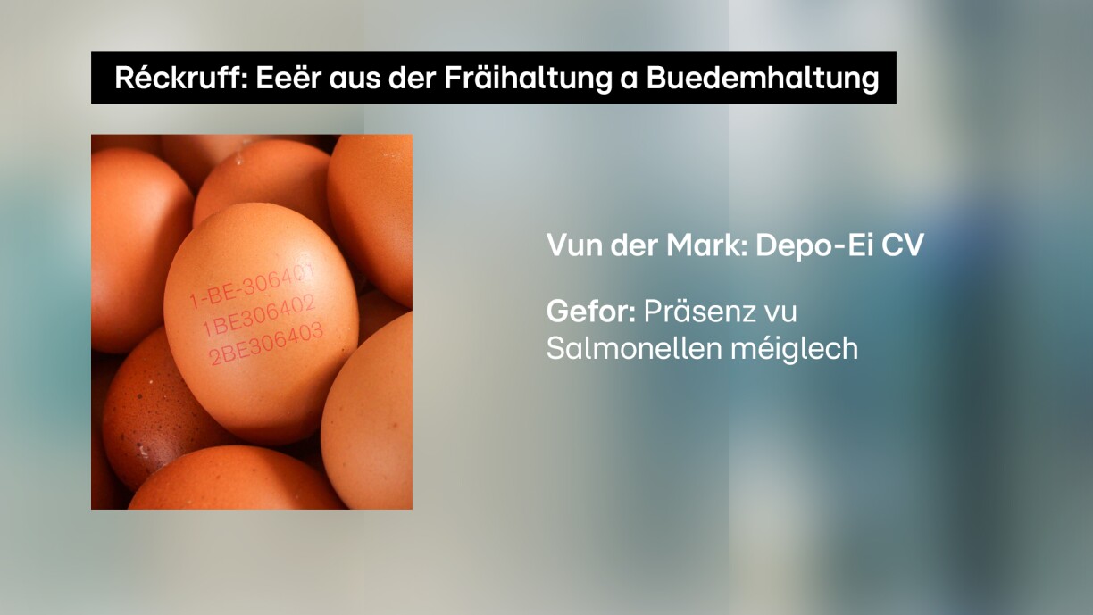 Wéinst Verdacht op SalmonellenRéckruff vun Eeër aus fräier Haltung an Eeër aus Buedemhaltung vun "Depo-Ei CV"