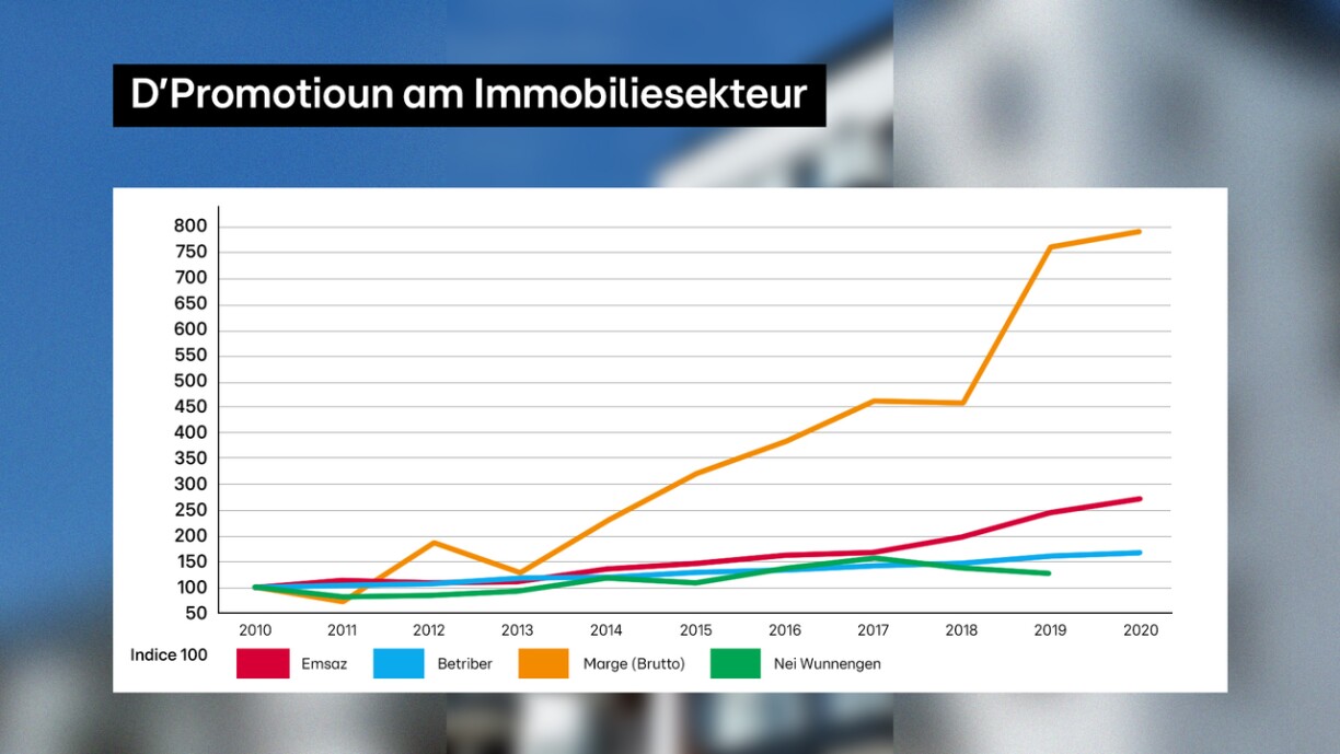 D’Promoteuren hunn hire Chiffre d’affaires tëscht 2010 an 2020 mat 2,7 multiplizéiert. Den Excédent Brut d’Exploitation, deen de Räichtum géing erëmginn deen erwirtschaft gouf, wier am nämmlechten Zäitraum ëm dat aachtfach gewuess. Allerdéngs ouni, datt d’Zuel vun de gebaute Wunnengen oder vun den Entreprisen am Secteur geklomme wier.