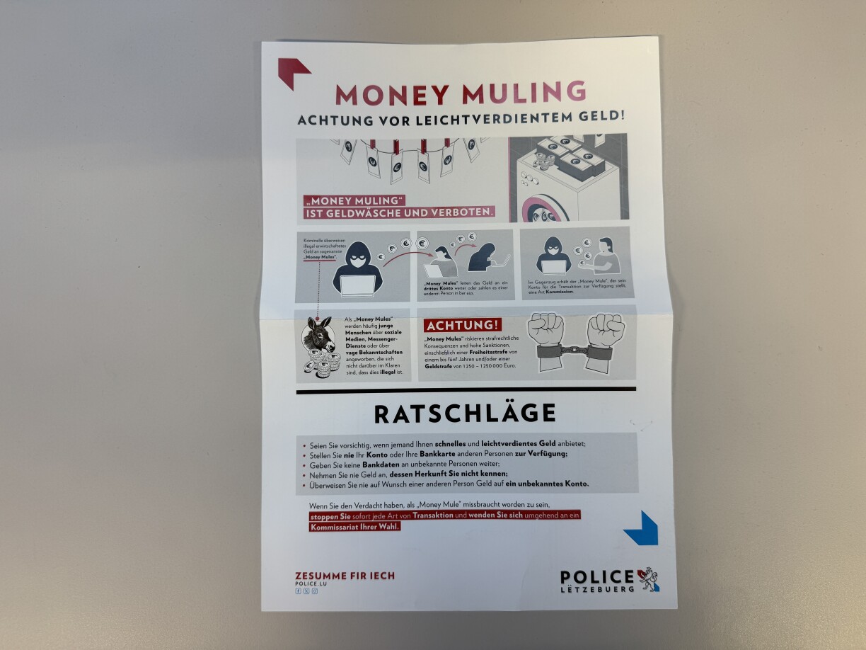 De Phänomen vum Money Muling géing, am Kader vu Phishing-Attacken, zouhuelen. De Schued léich zanter Hierscht 2023 bei 12,3 Milliounen Euro. 2 Milliounen hätt ee kënne recuperéieren.