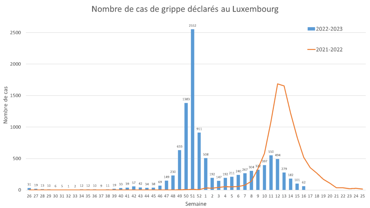 Kuckt ee sech d’Grafik vun der Santé un, war de Peak vun der Grippe-Saison an der Woch vum 19. bis de 25. Dezember 2022 mat ganzen 2.552 Fäll. De Peak vun der Virrechter Grippesaison war wesentlech méi spéit an och méi schwaach. Am Wanter 2021/2022 war en op Enn Mäerz 2022 gefall.