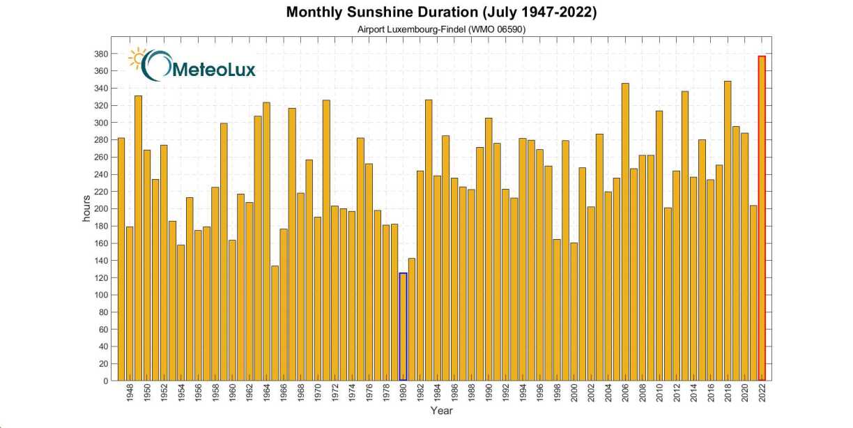 Domat huet de Juli 2022 en neie Rekord op d’Bee gestallt. Rekordmeeschter war bis dato de Juli 2018 mat 348 Stonne Sonn.