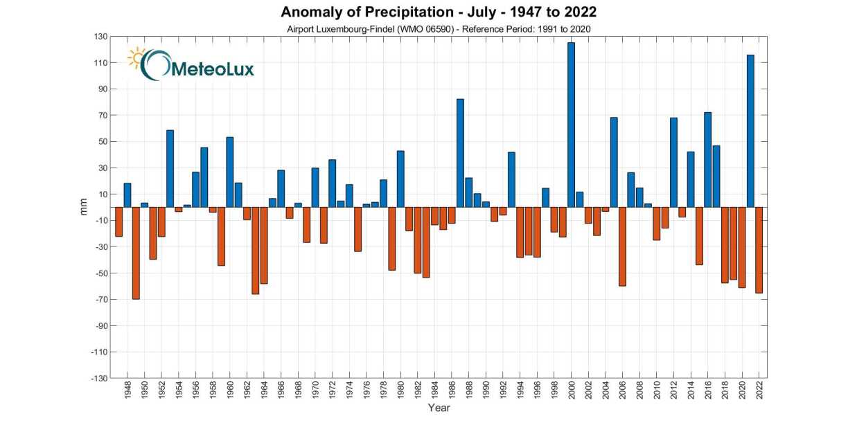 Et war e sonnegen a gläichzäiteg immens dréchene Mount mat 6,8 l/m². Wéi Meteolux mellt, war leschte Mount den drëttdréchenste Juli zanter den éischten Opzeechnungen am Joer 1947. Am mannsten Nidderschlag koum am Joer 1949 erof mat 2,2 l/m².