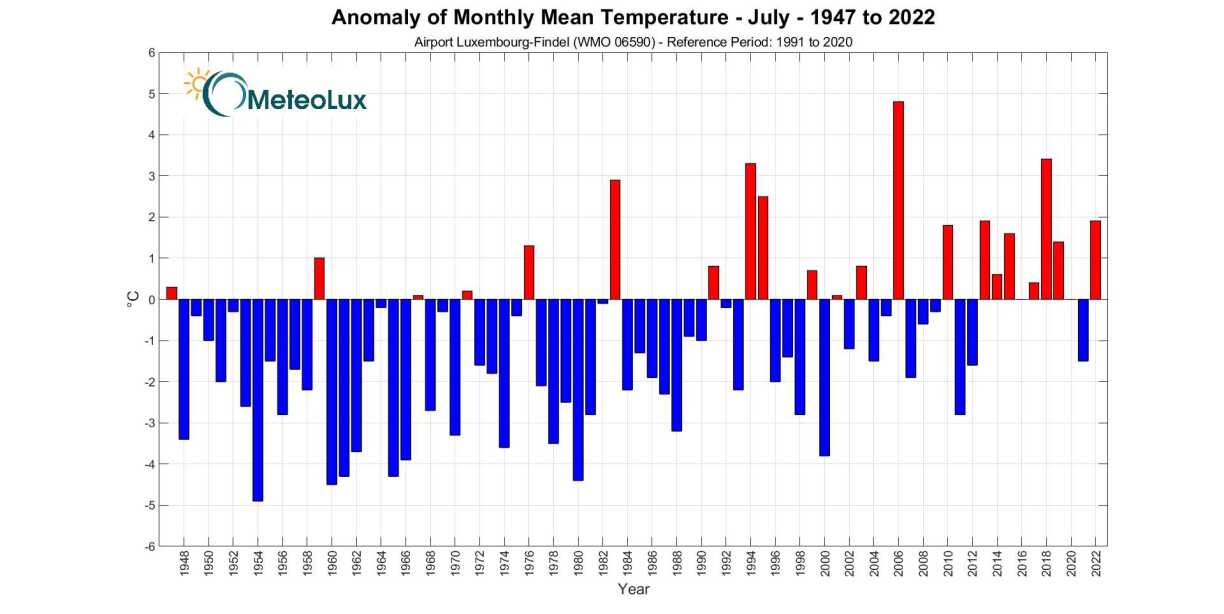 Mat Bléck op d’Temperature konnt festgestallt ginn, dass et e waarme Juli war, wat awer net aussergewéinlech fir e Summermount ass. D’Duerchschnëttstemperatur louch dëst Joer bei 20,6 °C. Dat ass 1,9 °C méi wéi de Schnëtt vun de Joren 1991-2020 mat enger Moyenne vun 18,7 °C. De Juli 2022 kënnt op déi sechst Plaz vun de wäermste Juli-Méint zanter 1947.