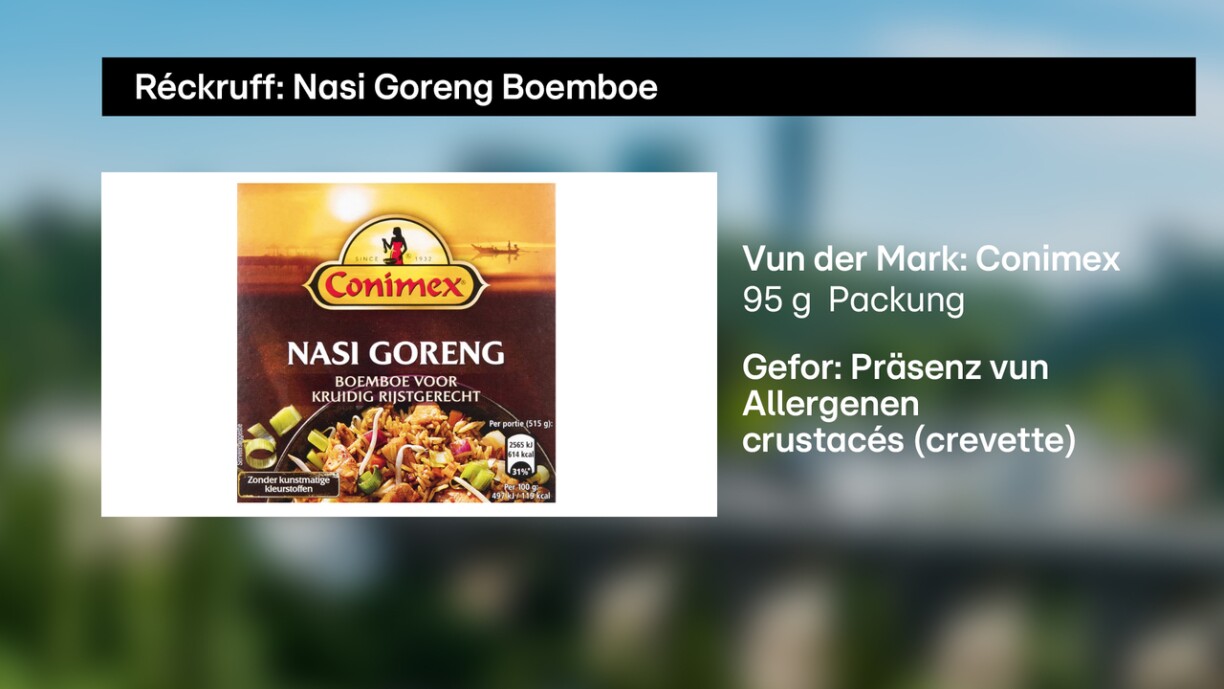 Leit, déi Allergië géint Crustacéen hunn an den Nasi Goreng iessen, op deem dësen Ingredient net opgelëscht ass, riskéieren dorop ze reagéieren. All aner Persounen, déi net intolerant oder allergesch sinn, kënnen de Produit vun der Mark Conimex ouni Bedenke consomméieren.