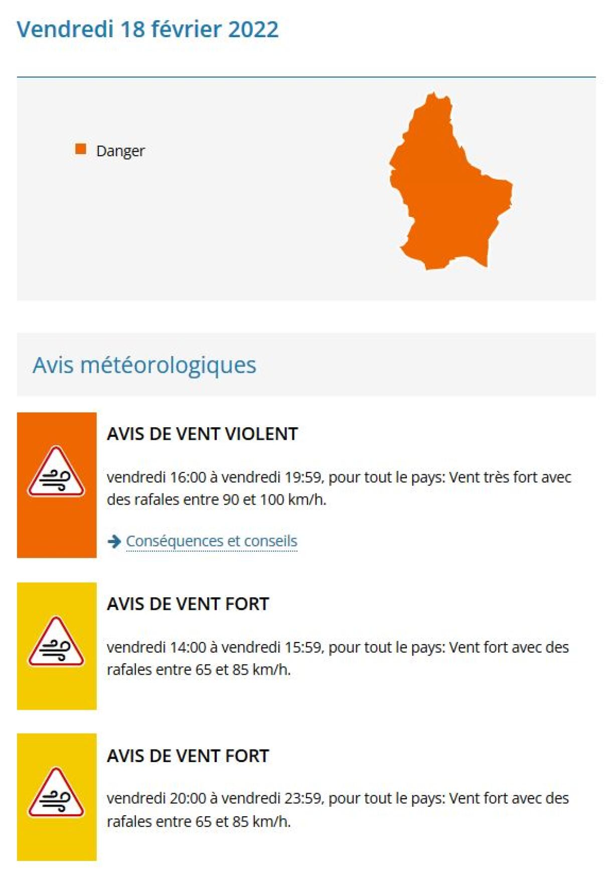 Meteolux huet fir e Freideg tëscht 16 an 20 Auer eng weider Alerte Orange erausginn, och nees fir dat ganzt Land. Staarke Wand aus dem Oste ka bis op Vitesse vun 90 bis 110 Stonnekilometer klammen. Scho vu 14 Auer u gëllt eng Alerte Jaune fir Wandstäerkten tëscht 65 a 85 Stonnekilometer. Dës gëllt och no der Alerte Orange nees tëscht 20 Auer bis Mëtternuecht.