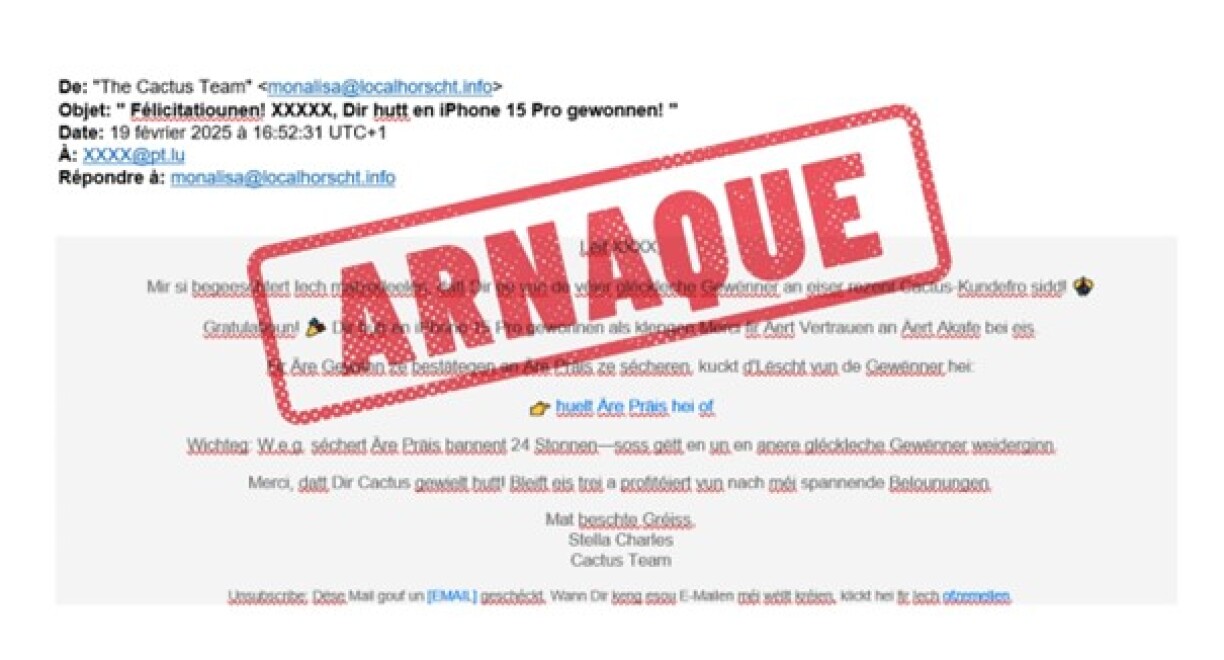Et ginn den Ament falsch Mailen an och Appellen, déi am Numm vum Supermarché gemaach ginn, an deenen ee virgegaukelt kritt, de Gewënner vun engem Concours ze sinn. All dëst stëmmt natierlech net, bei de Mailen handelt et sech also ëm Phishing.