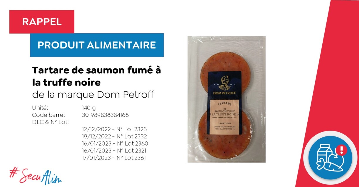 Wéi d’Administration luxembourgeoise vétérinaire et alimentaire e Freideg matdeelt, ass de Produit “Tartare de saumon fumé à la truffe noire” vun der Mark Dom Petroff aus de Regaler gezu ginn, dat wéinst der méiglecher Presenz vu Listerien.