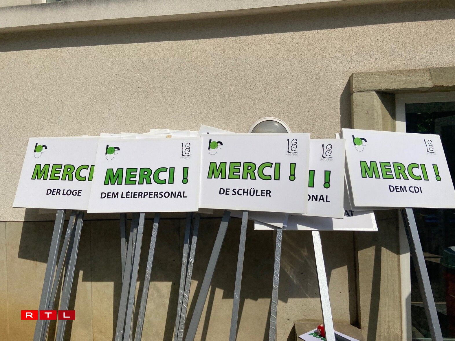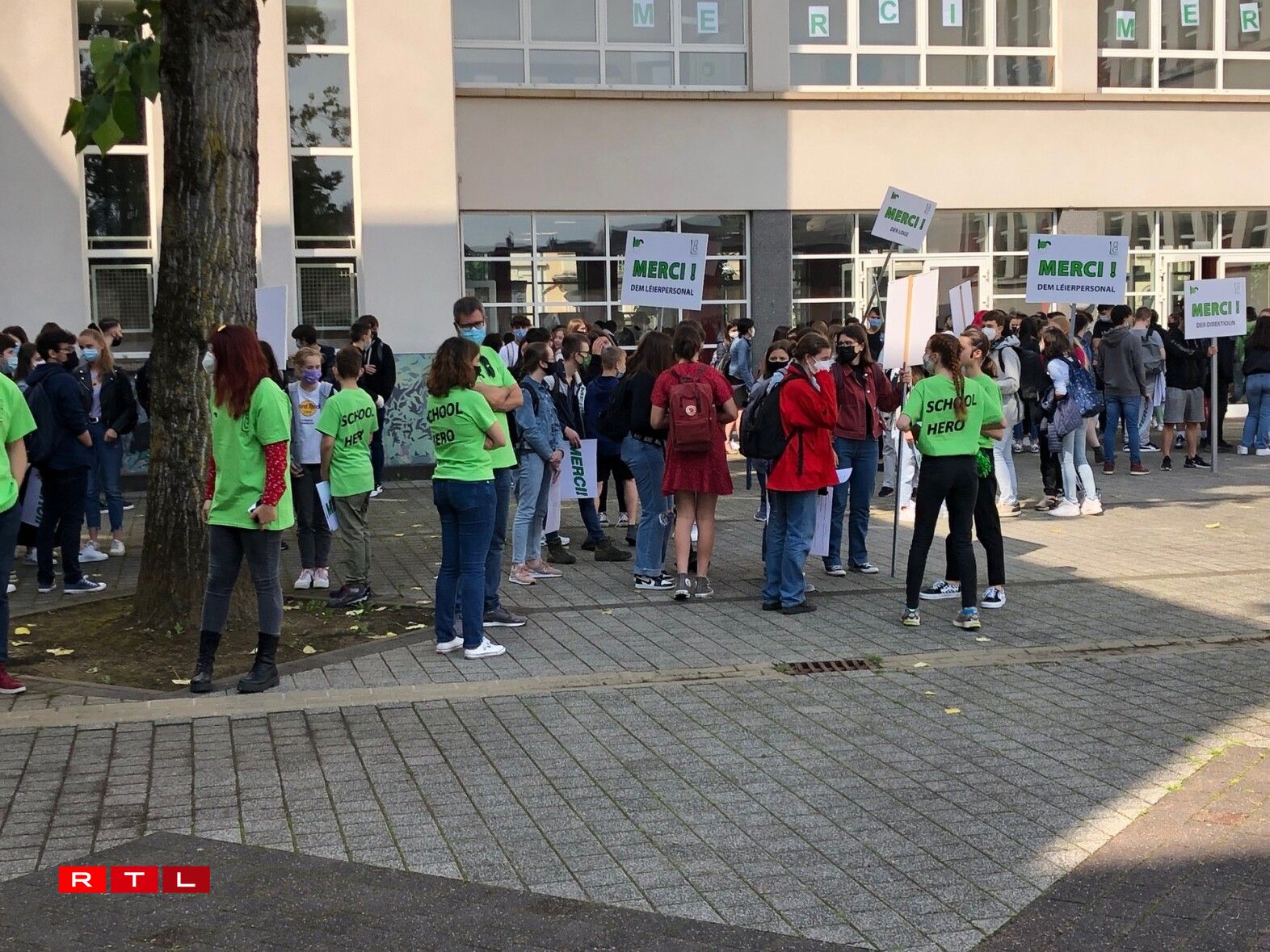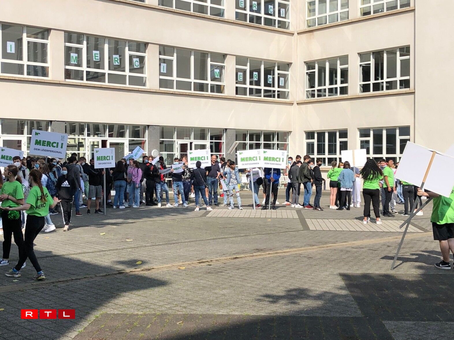 Nieft dem Flashmob waren d’Fënstere vum Lycée mat der Opschrëft Merci zougepecht ginn. D’Schüler hu sech souguer nach no der offizieller Schoulzäit mat Schëlter, wou deenen eenzelen Departementer vum Schoulpersonal Merci gesot gëtt, zesummen am Schoulhaff versammelt. An dat ganzt Personal krut T-Shirte mat der Opschrëft “School Heroes” geschenkt. Baséierend op d’Lidd „I need a Hero“ huet de Grupp hiren eegene perséinlechen Text am Stil “Ech brauch meng Schoul” entworf.