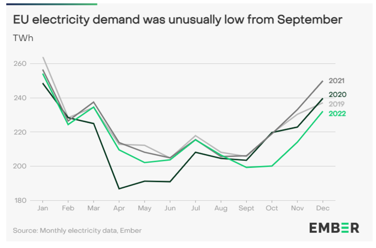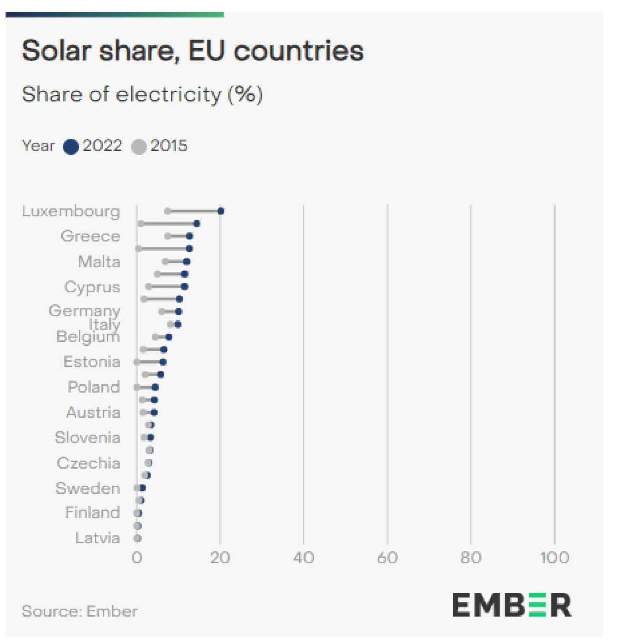 Datt manner Gas verbraucht gouf, wier och zum Deel politesch gesteiert, vill Länner hätte schonn an de leschte Joren Efforten am Ausbau vun den erneierbaren Energië gemaach. 2022 gouf et bei der Solarenergie e Plus vun 39TWh, dat ass eng Hausse vu 24 Prozent par rapport zu 2021.