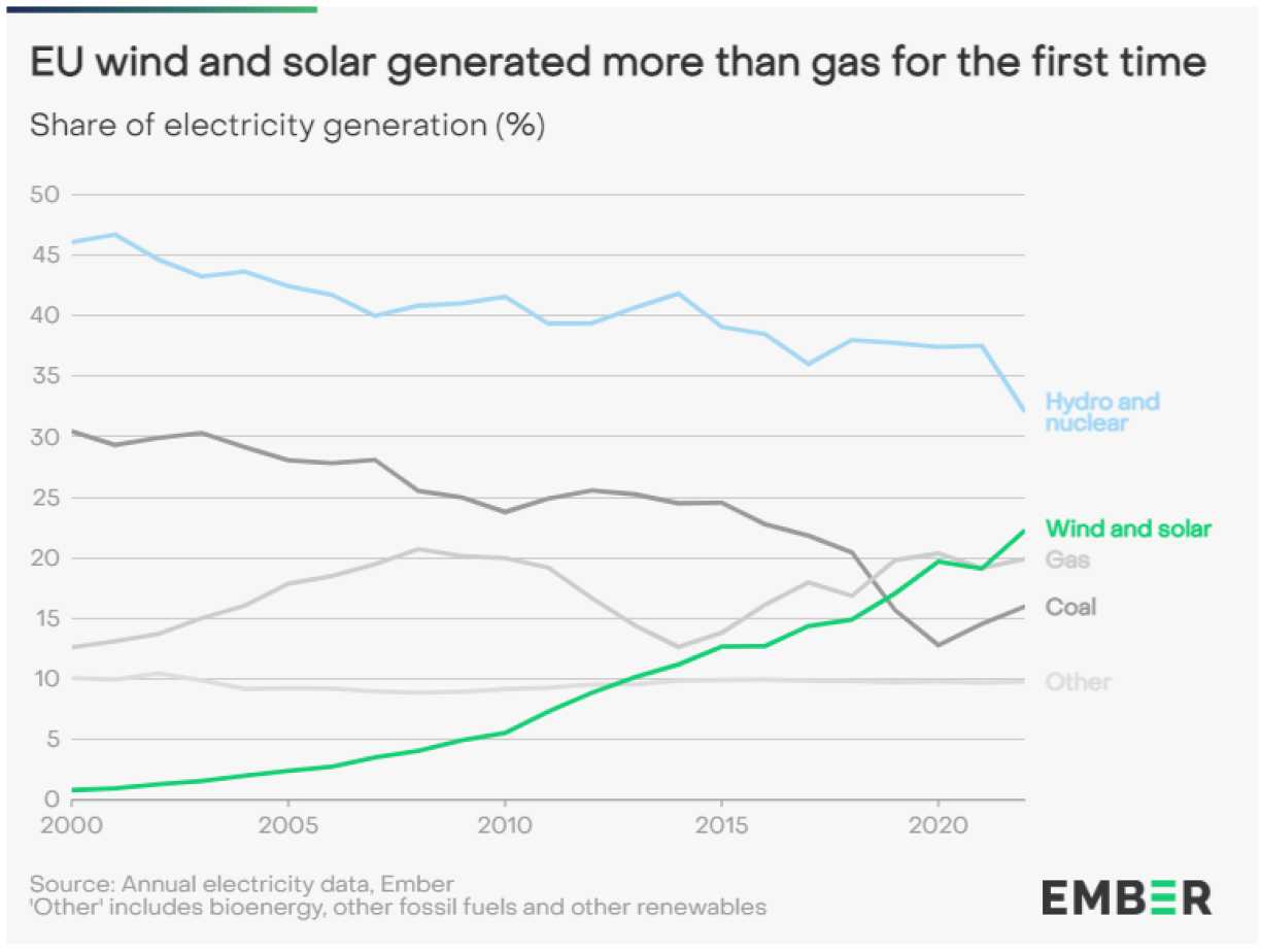 2022 gouf fir déi éischte Kéier méi Stroum aus Wand a Sonn, wei aus Gas gewonnen. Dat weisen Date vun Ember, enger onofhängeger Denkfabréck, déi sech mat Energiefroe befaasst.