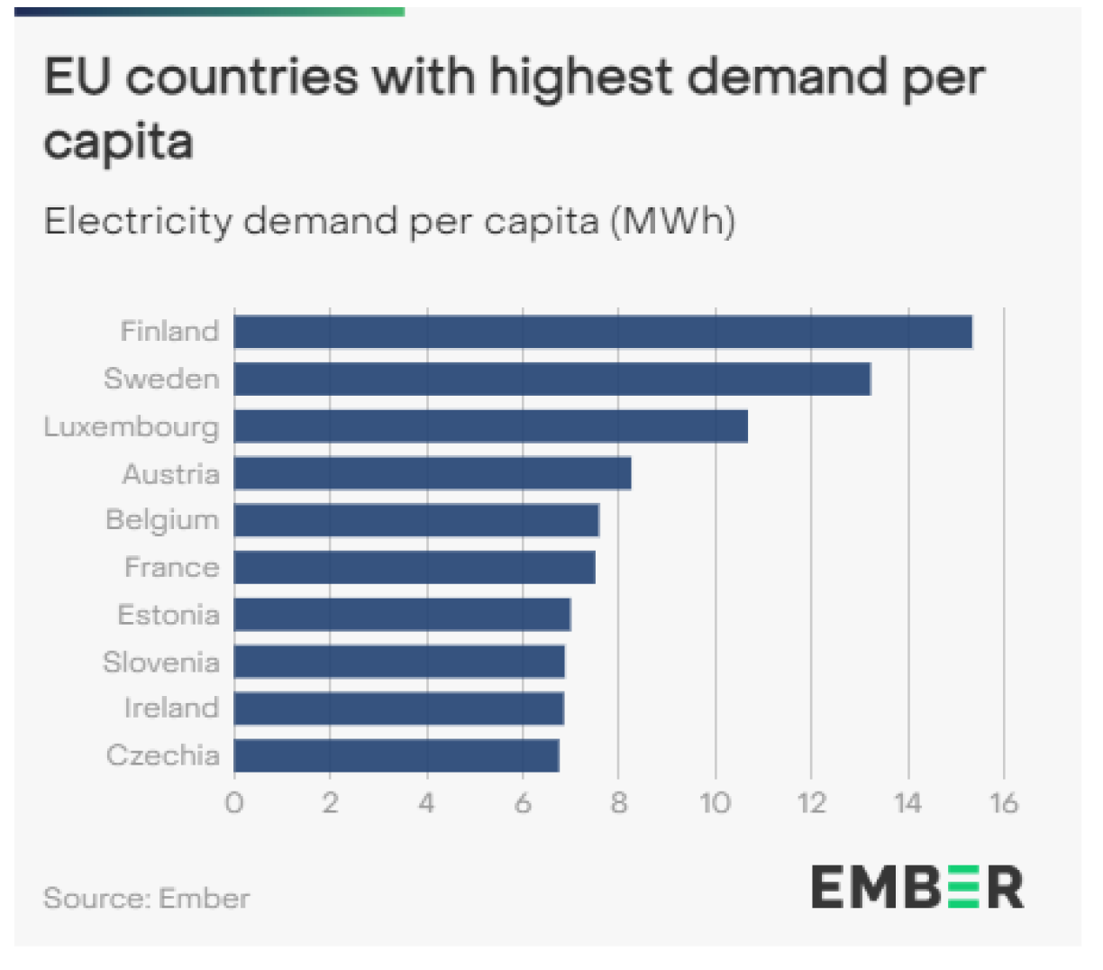 De pro Kapp Verbrauch u Stroum ass zu Lëtzebuerg hanner Finnland a Schweden am drëttgréissten. Am Grand-Duché wiere vill stroumintensiv Betriber.