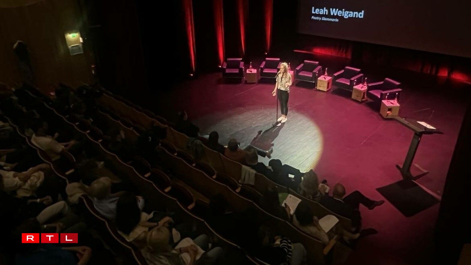 Eng däitsch Poetry-Slammerin war deen Owend och op Besuch. D’Leah Weigand ass 27 Joer al, huet am Gesondheetssecteur geschafft a war doduerch vill a Kontakt mat demente Leit. Schonn zënter Jore befaasst si sech an hirer Poesie mat Mënschen a positive wéi och negative Liewenssituatiounen. Duerch hir Aarbecht huet si dunn och e Gedicht aus der Siicht vun engem Demenzkranke geschriwwen.