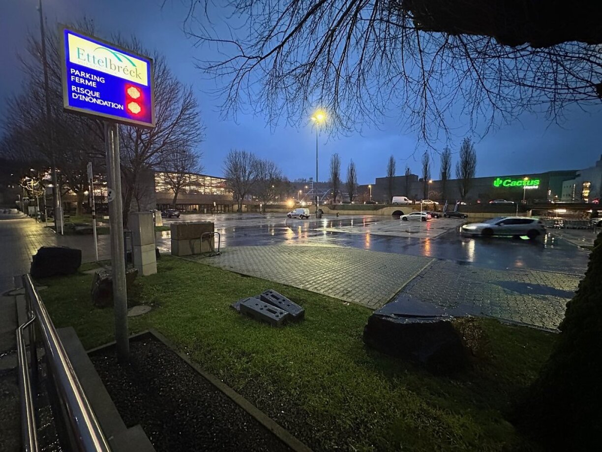 E Mëttwoch de Mëtteg war jo vun der Gemeng Ettelbréck den Opruff komm, dass ee wéinst der Héichwaassergefor säin Auto vum Parking Däich misst ewechhuelen an op kee Fall iwwer Nuecht do stoe loosse soll. Dësen Opruff gëllt weiderhin.