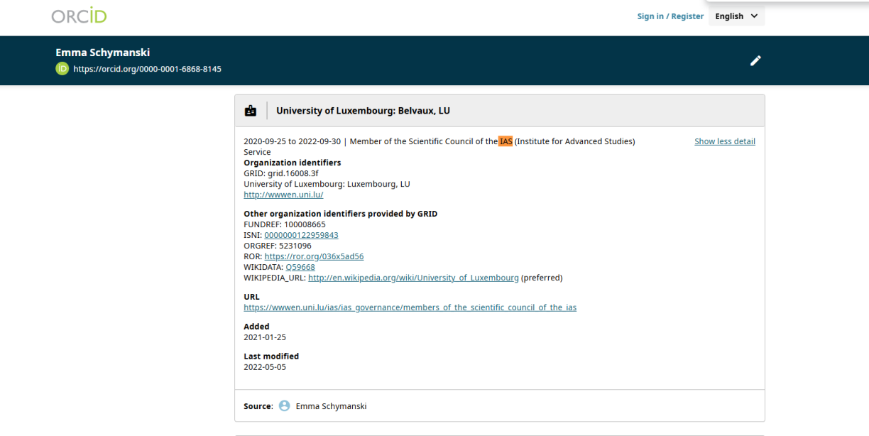 D’Emma Schymanski schreift op hirem eegenen CV, datt si vu September 2020 bis September 2022 Member am Conseil Scientifique vum IAS war.