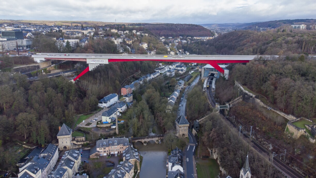 Eigentlech hätten d’Aarbechten um Pont Grande-Duchesse Charlotte jo scho sollten am Fréijoer d’lescht Joer fäerdeg ginn, ma duerch d’Pandemie, engem Mangel u Matières-premièren an och vill Onwiedere mat staarkem Wand wieren d’Aarbechten ëmmer nees ënnerbrach ginn.