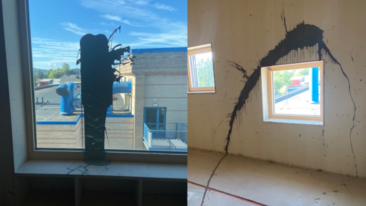 A méi Raim gouf Faarf op Maueren, Fënsteren, Schief an och op de Buedem geschmiert. Passéiert ass dëst an engem Zäitraum tëscht dem 6. Juli um 16 Auer an dem 8. Juli ëm 7.30 Auer.