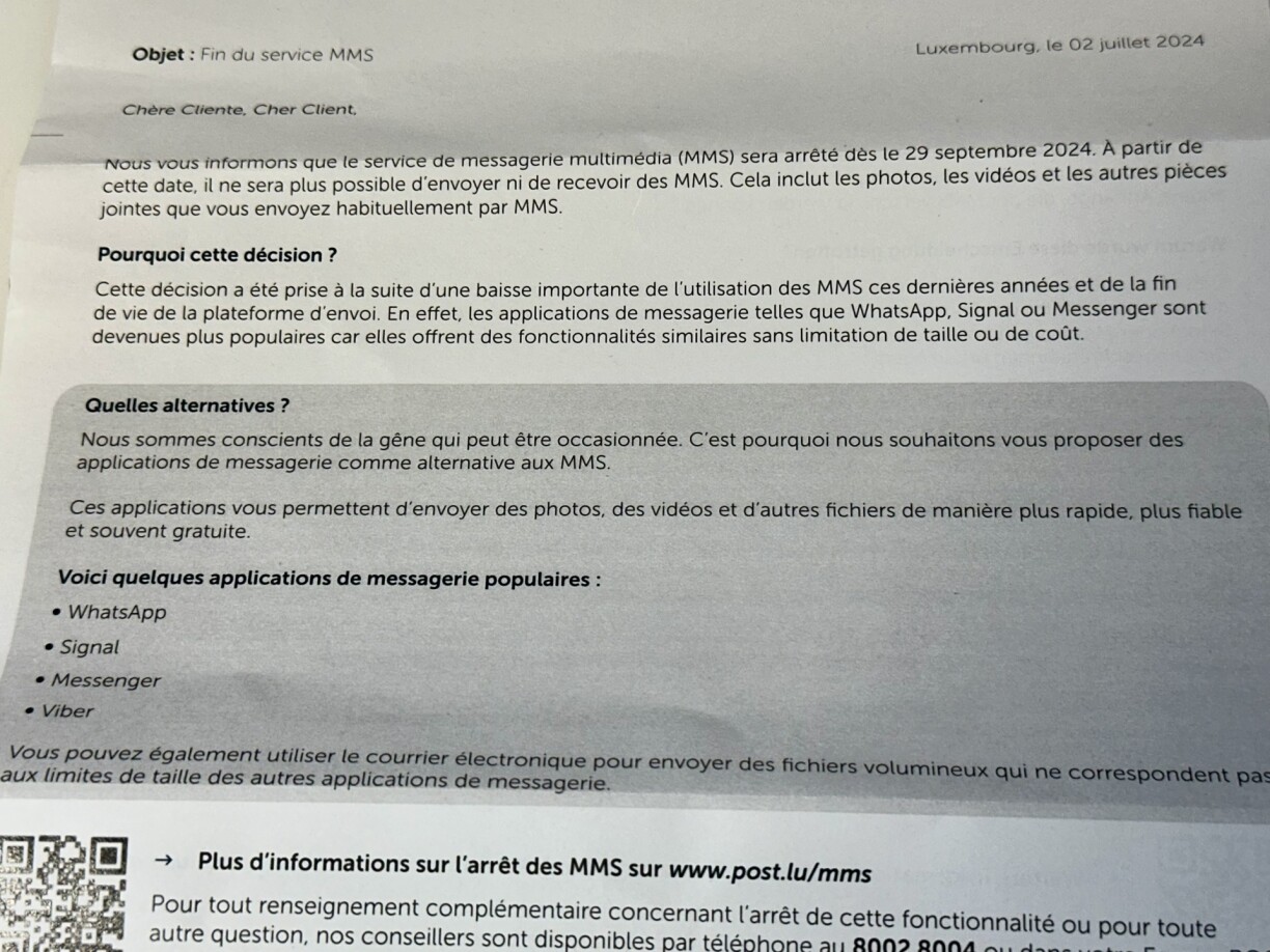 D’Post begrënnt d’Decisioun domat, datt an de leschte Joren net méi vill MMSe verschéckt goufen. Doriwwer eraus géingen ëmmer méi Leit d’Messenger-Déngschter wéi Whatsapp, Signal, Viber oder Messenger benotzen, well dës net an der Gréisst limitéiert sinn an näischt kaschten. Dës recommandéiert d’Post hire Clienten dann och nieft E-Mailen als Alternativ zu den MMSen.