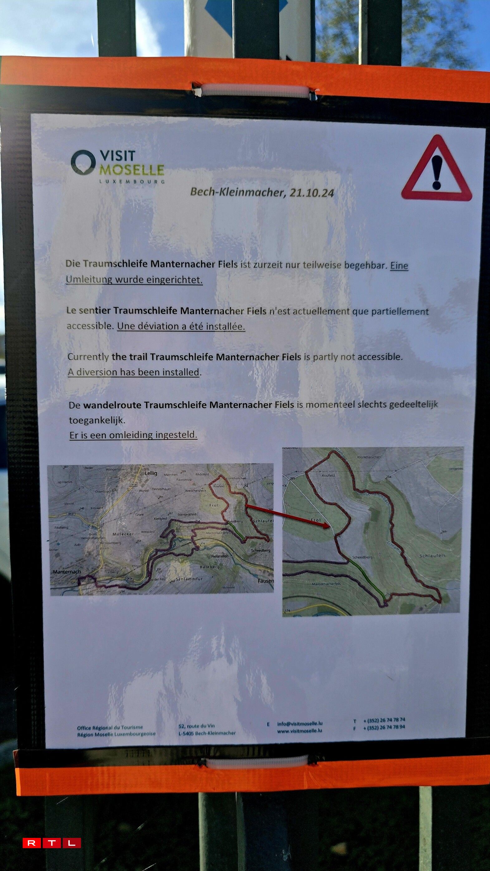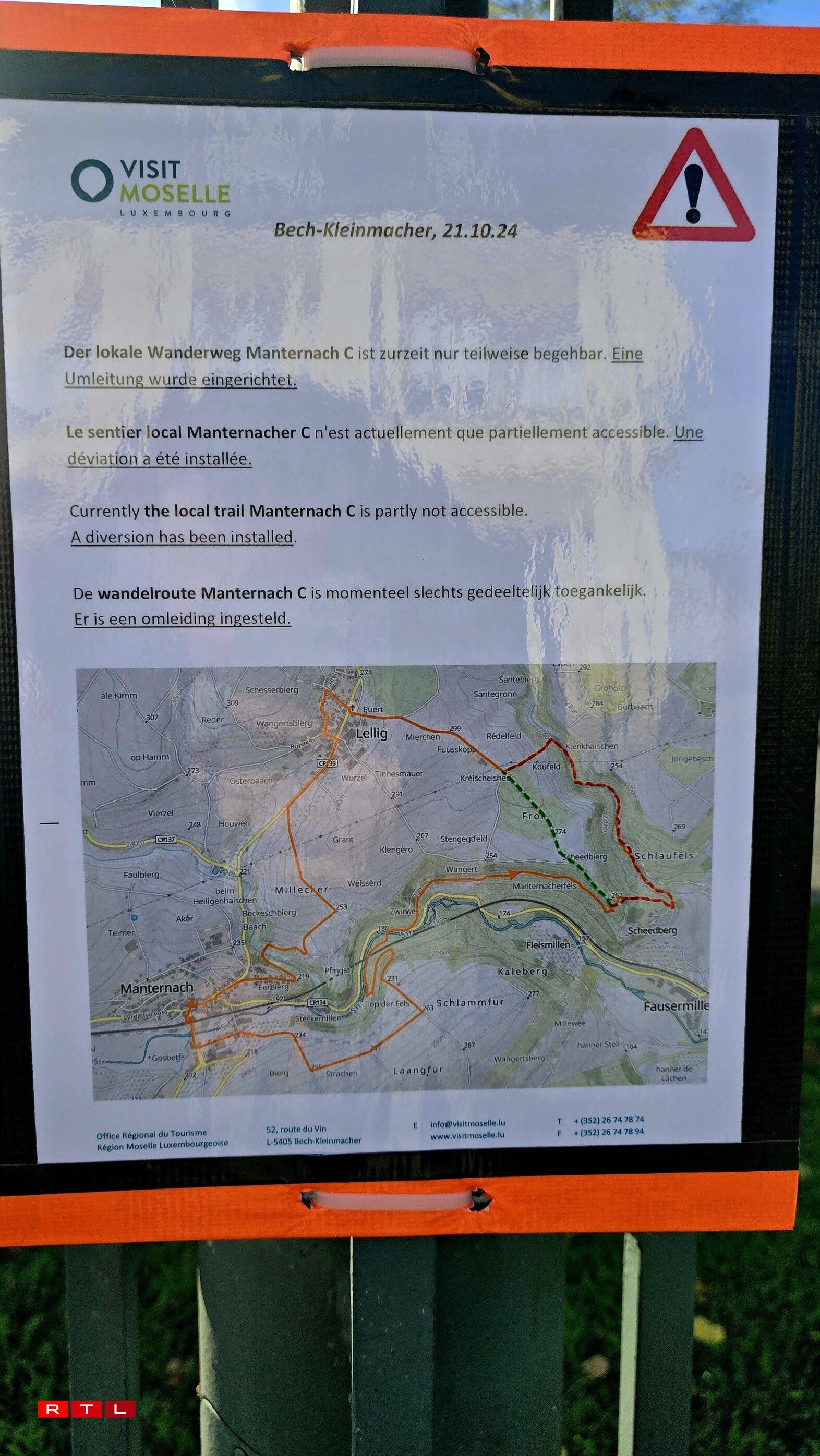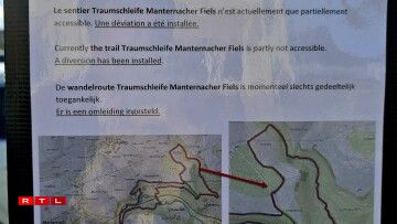 De betraffenen Deel vum Wanderwee ass bis op Weideres gespaart, dat confirméiert de Buergermeeschter vu Manternach op RTL-Nofro. Um Mëttwoch géif een am Schäfferot decidéieren, wéi et viru geet.