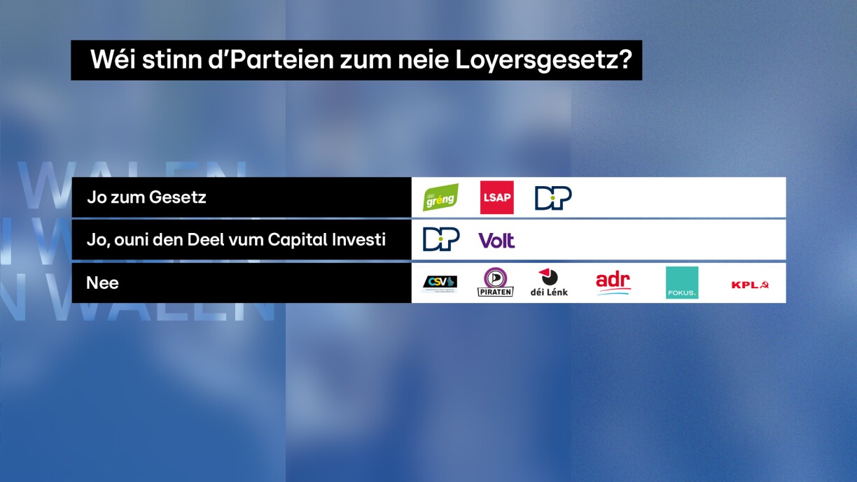Eigentlech sollten duerch d’Reform vum Loyersgesetz d’Loyeren deels gedeckelt kënne ginn, mä quasi keng Partei war sou richteg d’Accord mat der Propos aus dem Logements-Ministère. Wéi d’Politik an Zukunft mat deem Problem ëmgoe wéilt, ob si am fréiere Land vun de Proprietären iwwerhaapt eppes fir d’Locatairë virgesinn huet a wéi si de Problem wëll ugoen, huet d’Anne Wolff nogefrot. Am éischten Deel vun eiser Serie iwwertreffe sech d’Parteie mat Proposen, fir de Portmonni vun de Locatairen z’entlaaschten. Plus 11,5 Prozent an engem Joer bei de Loyeren. An da kënnt dobäi, datt de Bausecteur Alarm schléit: 1.500 Logementer géifen dëst Joer manner gebaut ginn, bei de Baugeneemegungen ass et en Abroch vun 33%.